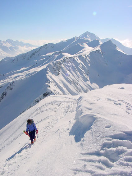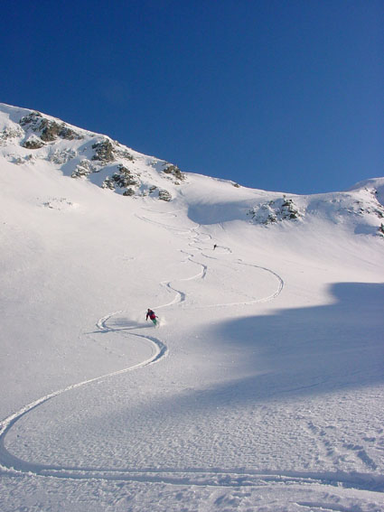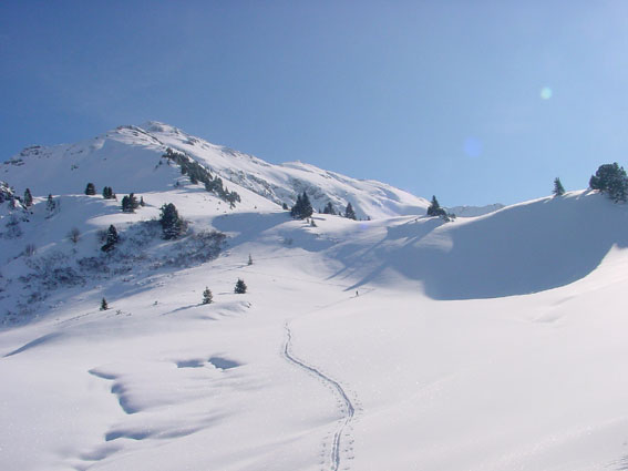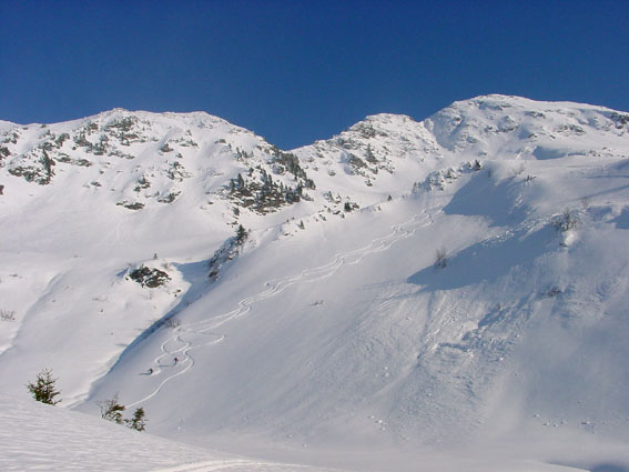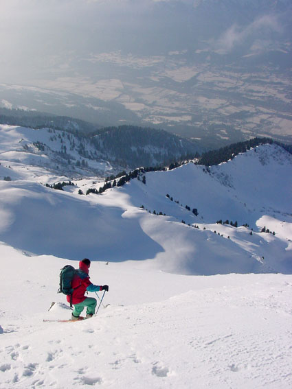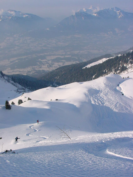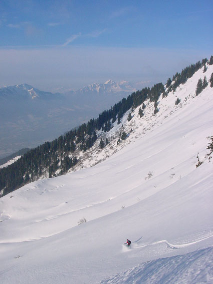 Mais que font les savoyards ? Nous avons suivi une trace de raquettes jusqu'à 1100 m (merci), croisé une trace de ski nordique empruntant les routes transversales et vu des traces sur le versant est (tarentaise) du corbeau. Mais rien sur tout le panneau ouest du grand arc. Incroyable, alors qu'ici, contrairement à l'Isère, le vent n'a pas soufflé au-dessus de la foret. Résultat une poudreuse de cinéma sur près de 1600 m sur un itinéraire extraordinaire, jamais sanglier. Une pure merveille.