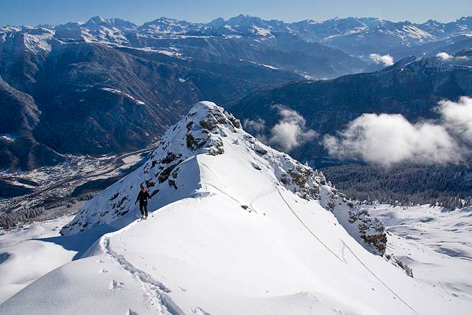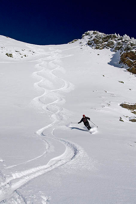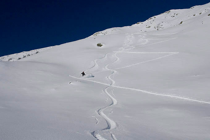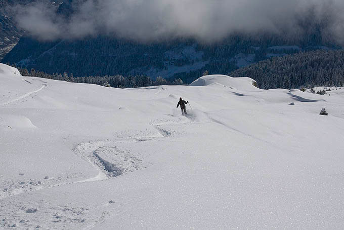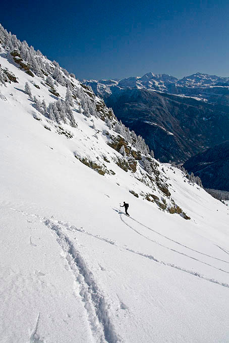 Une virée en Lauzière, ce qui n'est finalement pas si loin de Grenoble (1h de route à peine) et surtout, c'est là qu'il y a de la neige en ce moment. Et pas n'importe quelle neige ! 1600m de descente intégralement en poudre légère ce jour. Pour la quantité, ça ne touche pas hors forêt en choisissant les combes plutôt que les croupes et dans la forêt, ça passe relativement bien malgré quelques touchettes inévitables ça et là, essentiellement des branches. Avec 40 cm supplémentaires seulement, ça sera impeccable. Très belle balade facile.