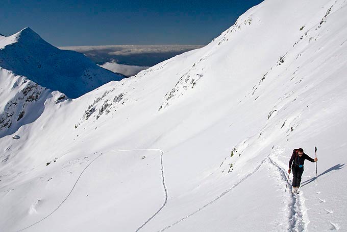 neige froide en toutes orientations même plein sud ce qui ne devrait plus être le cas à partir de vendredi. Dans les 100 derniers mètres, on a le choix entre une pente sud qui sort sur l'arête est ou une pente sud-est qui sort sur l'arête sud. Cette dernière nous a paru plus chargée, aussi nous avons préféré passer par la première. Mais ce ne sont que des suppositions "à l'oeil". Jusqu'à 2300 m, aucune trace de coulées sauf quelques petites purges à la base de rochers plein sud.