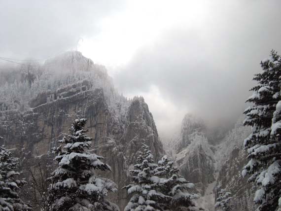 Trucherelle -> poyet par la route (damée) -> caron par la piste, puis dans la foret (legere redescente pour contourner le chaos) jusqu'au pied de l'Y à l'ouest de la dent du Loup. Remontée du premier couloir (branche ouest de l'Y) jusqu'à 1300 m (surplomb), puis descente à l'Y et remontée de la branche orientale jusqu'à 1290, nouveau surplomb => retour.
