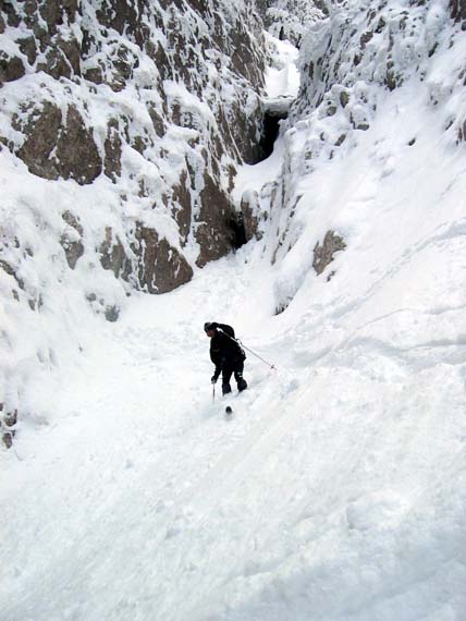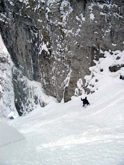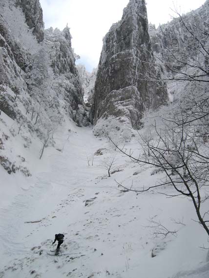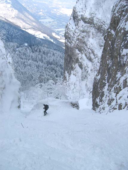 C'est evidemment un but. Les obstacles des deux couloirs ne sont absolument pas comblés : les 100-130 derniers metres ne sont pas skiables dans les conditions actuelles. Et l'approche dans le chaos de blocs sous le couloir est elle-même trop peu enneigée pour se lâcher. On ne regrette pas de ne pas avoir tenté la descente depuis le haut, dans ce cirque à l'ambiance particuliere au-dessus d'une zone industrielle, sous une ligne électrique et avec l'autoroute en fond sonore.