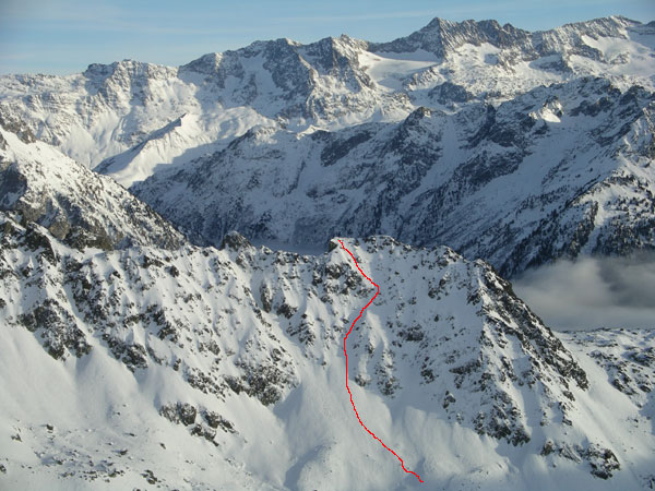 C17, puis en redescendant, le couloir NW à droite du couloir W du Pas du Pin.