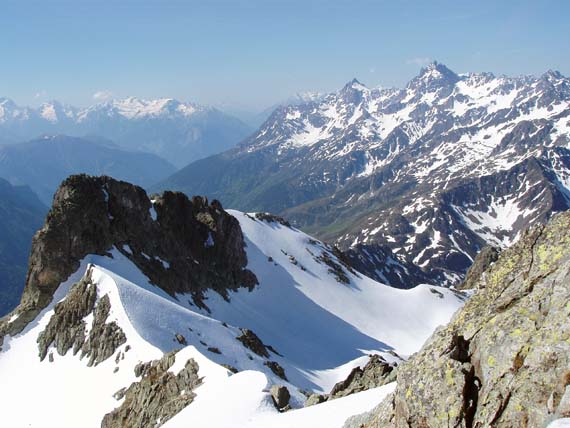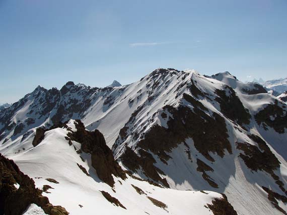 Pour la première fois, j'arrive à monter à skis (et vu la neige tant mieux). La corniche du couloir est inexistante et se passe sans problème sans conversion acrobatique, cela confirme l'observation de VSH de l'importance du rôle du vent de nord cette année qui ici a supprimé la corniche habituelle et a comblé l'entrée du couloir