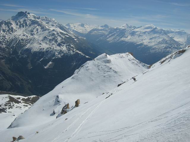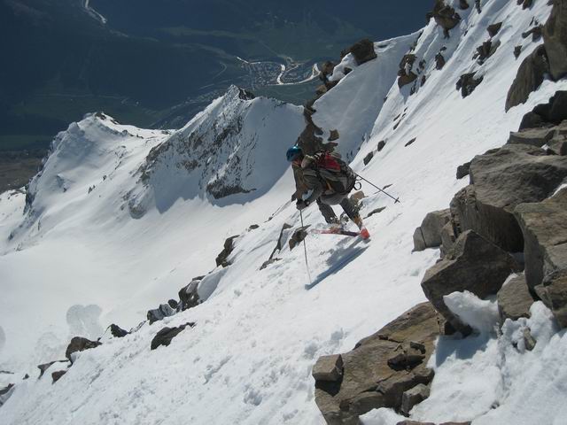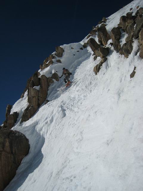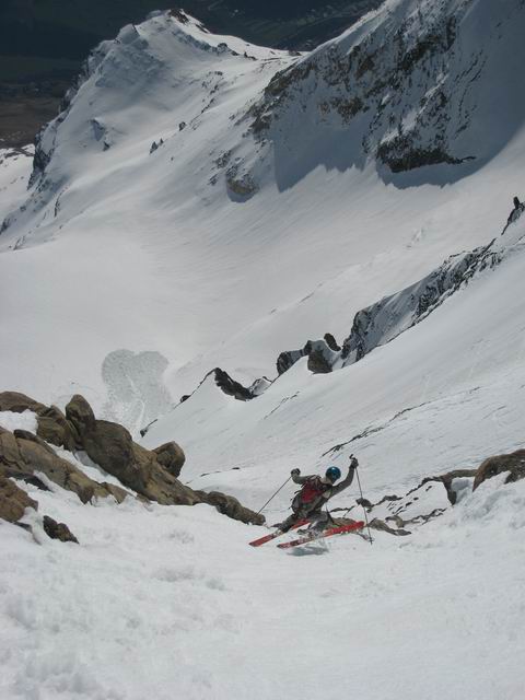 Toute la rive droite de bonne nuit est partie depuis la crête sur > 1 km, céant un gros dépot. Grâce au non regel (pour une fois), les monstrueuses boules sont négociables à ski. Des pénitents sous le couloir sud-est, qui lui-même commence à prendre du relief. Dans la face, transfo à point à 9h45. Sous le rappel, on est allé cherché complètement rive droite et on a skié les 300m de la grande pente médiane en poudre réchauffée, énorme !