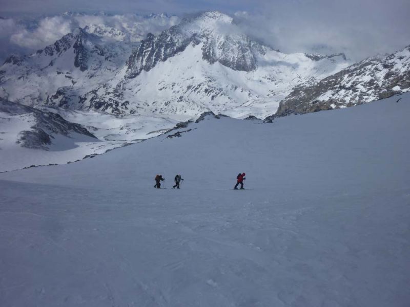 J2 : montée dans les nuages et le vent au col de Labby, heureusement comme prévu l'amélioration de la mi-journée est ponctuelle et nous offre une superbe descente du glacier de la Mahure. Descente par Montafia où une surprise nous attend : le pont 1971 sur le torrent du Pisset est démonté : passage un poil scabreux 20 m en aval (corde utile selon expérience des skieurs).