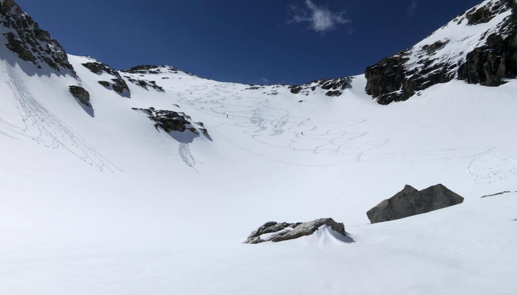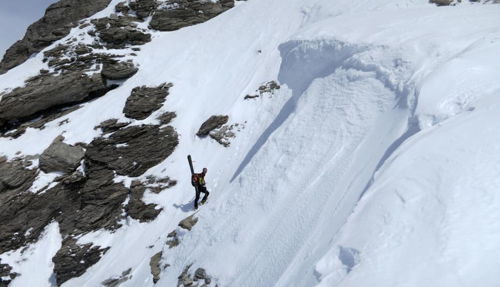 Regel béton. Les conditions on bien changé depuis lundi, avec beaucoup de pentes durcies par le vent de la veille, et des accumulations en altitude, pas très épaisses, mais suffisantes pour nous faire renoncer à descendre à vue le couloir nord, après que nous y ayons découpé un coin et l'avoir vu glisser sans effort sur une 20taine de cm.