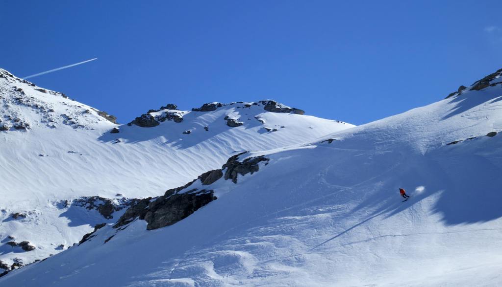 L'objectif initial était de rejoindre le refuge via le couloir N des dents d'Ambin et le col Clapier de Savine. Tout se goupillait bien avec 2 voitures garées très haut dans Ambin et dans Etache, un regel béton, un saupoudrage dès 2200m. Puis la nivo d'abord, et le déneigement de la rampe en versant sud-est ensuite, ont sensiblement modifié l'itinéraire. Tout inconvenient ayant ses avantages, nous n'avons rejoint le refuge qu'en fin d'aprèm, en profitant des belles lumières.