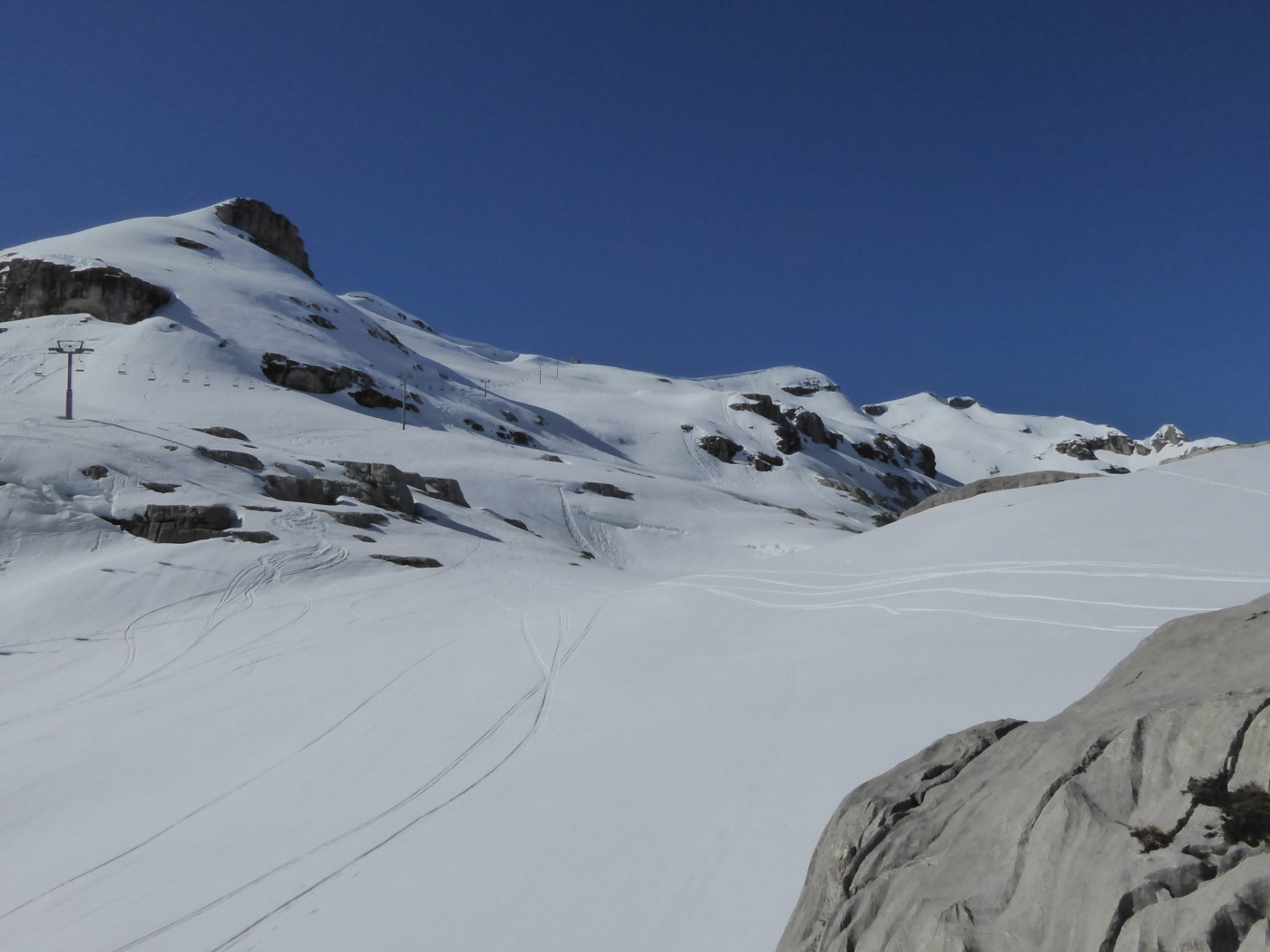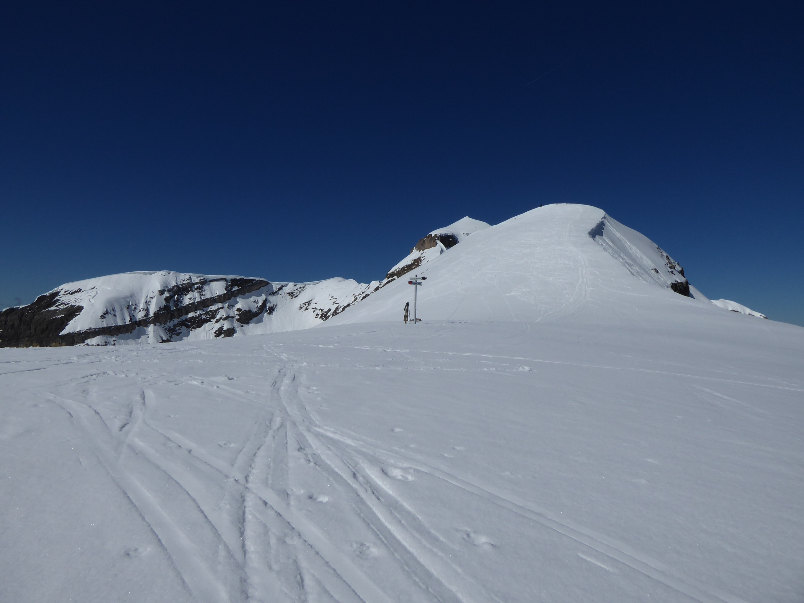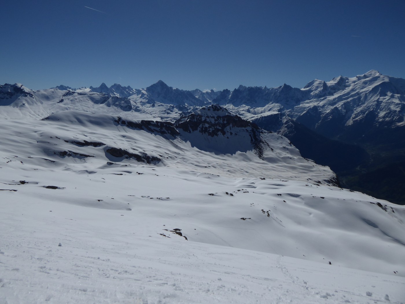 Flaine, montée à la tête des Lindars (en montant sous le télésiège). Descente sur le refuge de Platé jusque 100m au-dessus du refuge. Montée au col de la Portette. Descente versant E jusque 2180. Remontée aux grandes Platières, descente par les pistes.