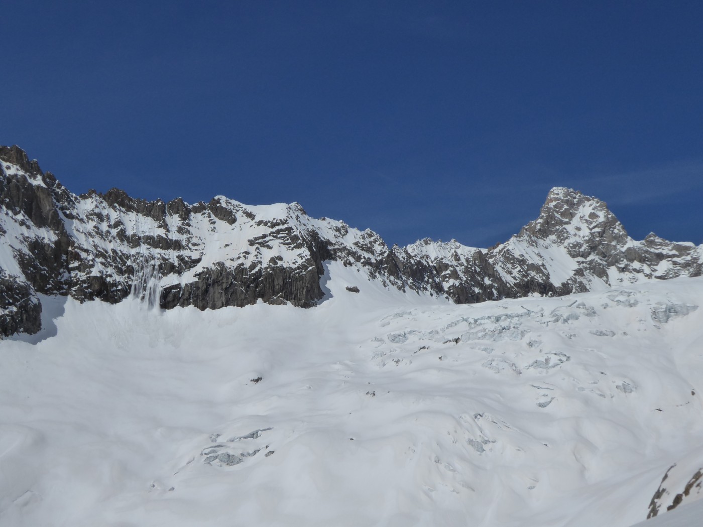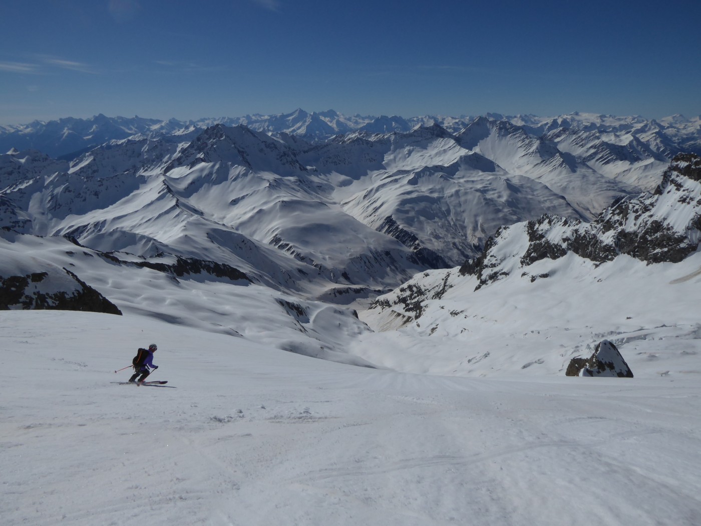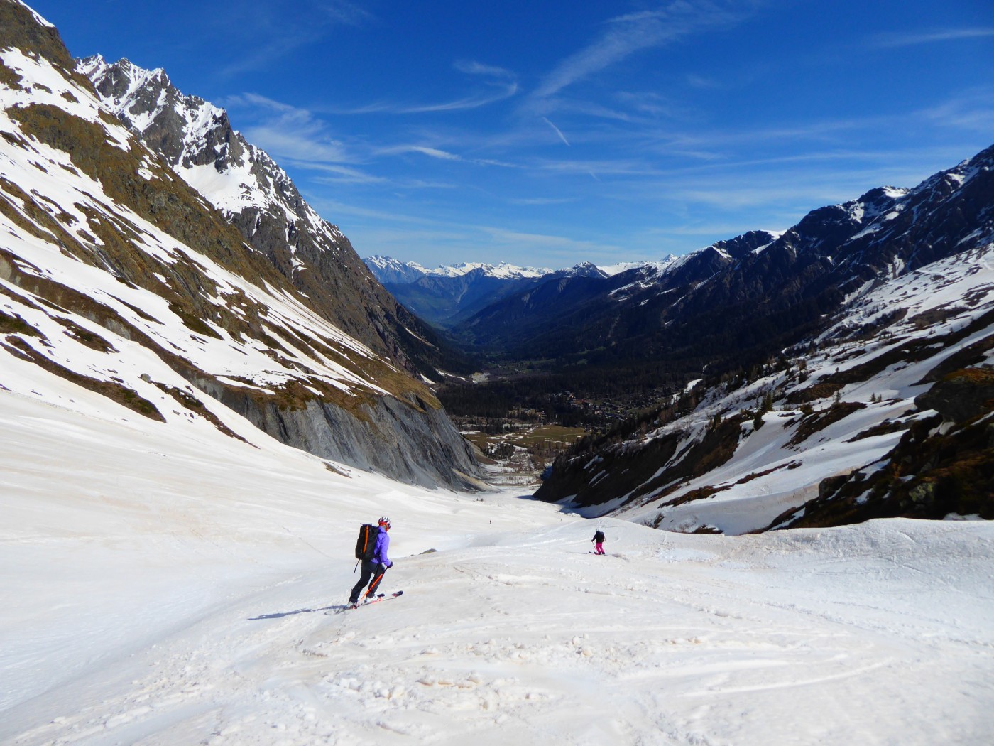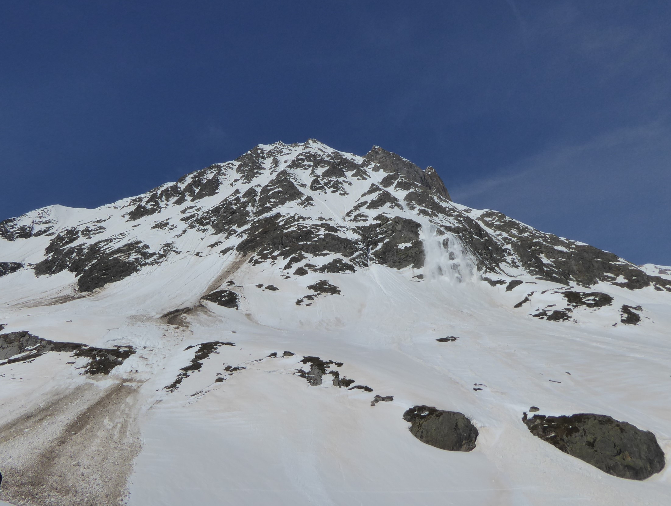 Neige transformée à tous les étages. Avec les températures printanières, dès 11h la traversée (SE) vers le petit col Ferret est déjà bien molle tandis que les pentes sud au-dessus de 3000 sont encore dures. Nombreuses purges dans les pentes raides E à SE.