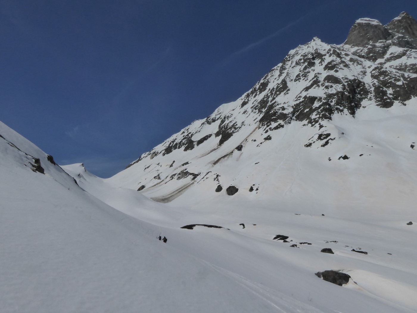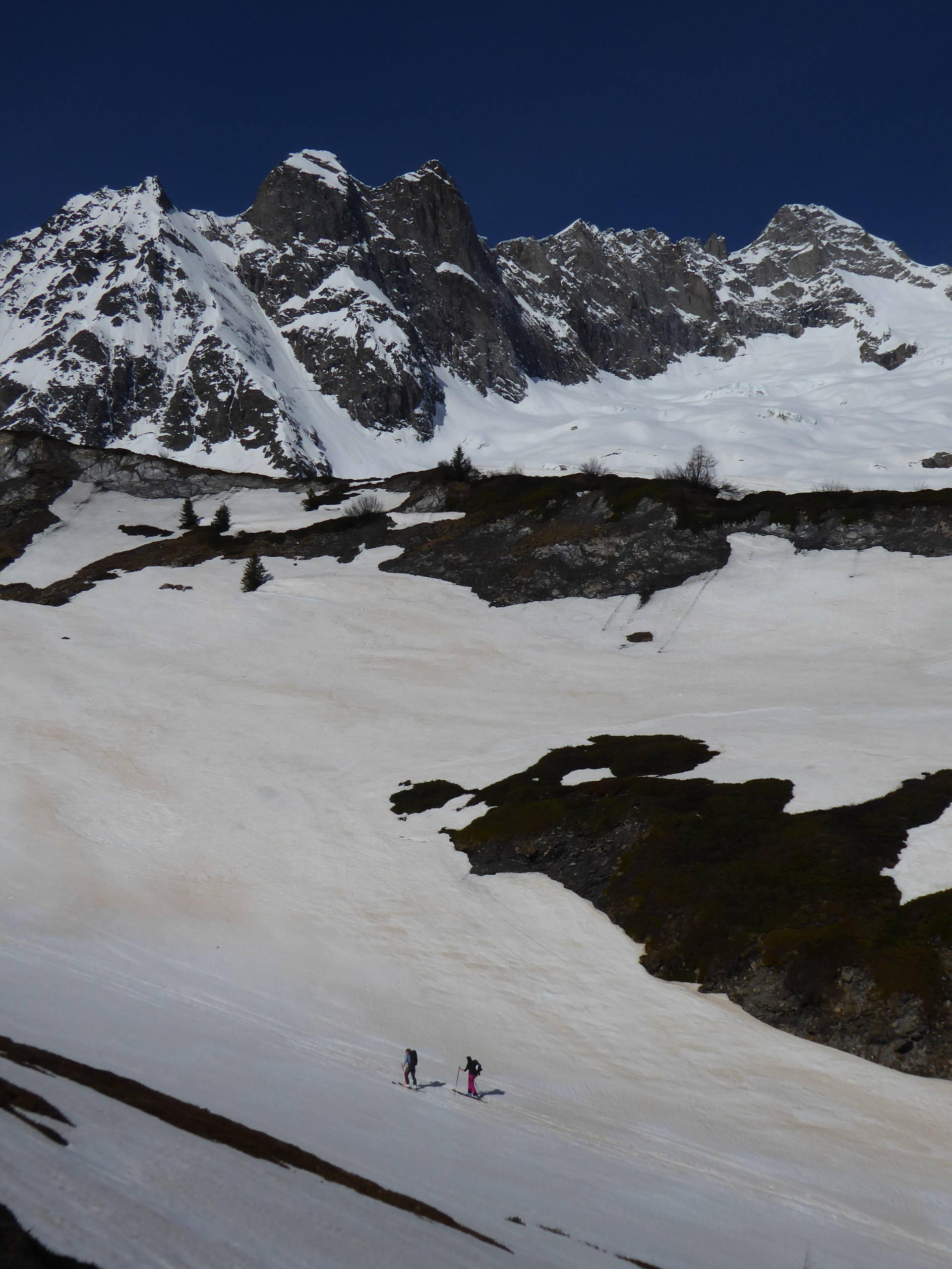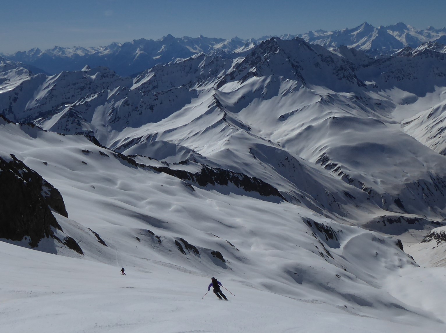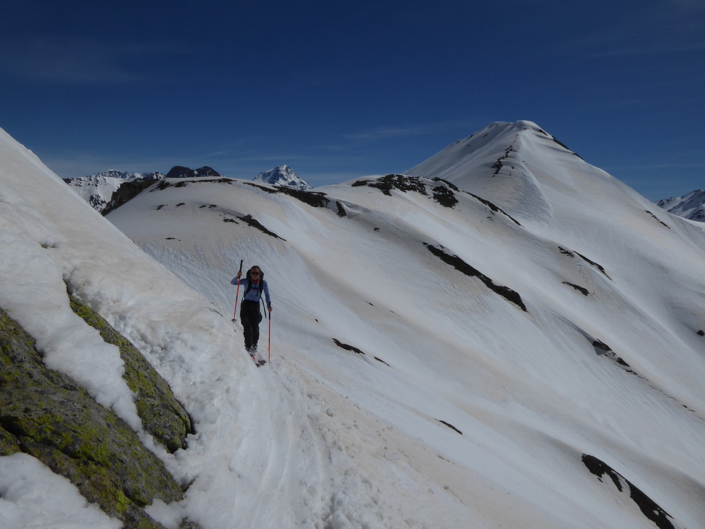 Neige transformée à tous les étages. Avec les températures printanières, dès 11h la traversée (SE) vers le petit col Ferret est déjà bien molle tandis que les pentes sud au-dessus de 3000 sont encore dures. Nombreuses purges dans les pentes raides E à SE.