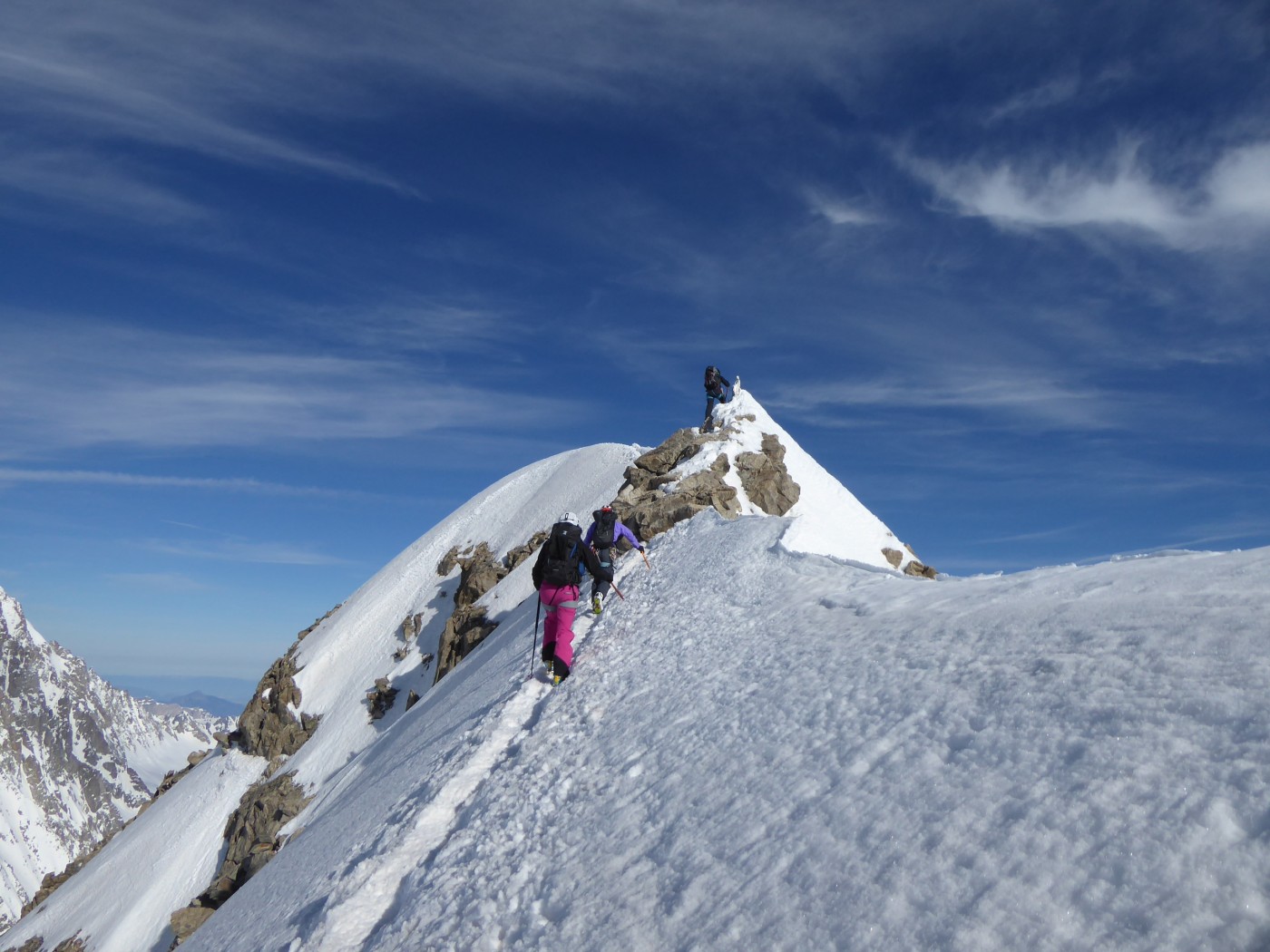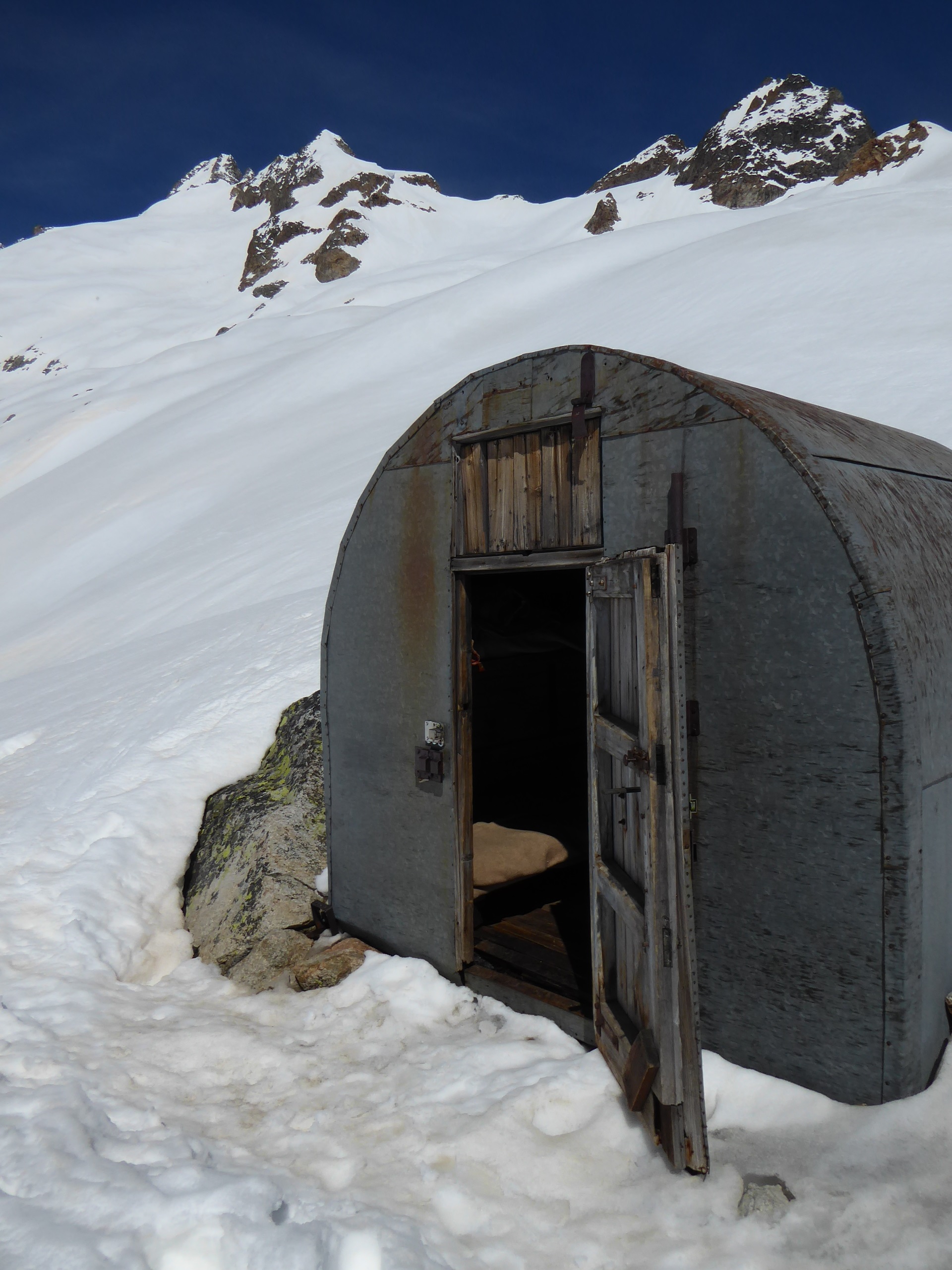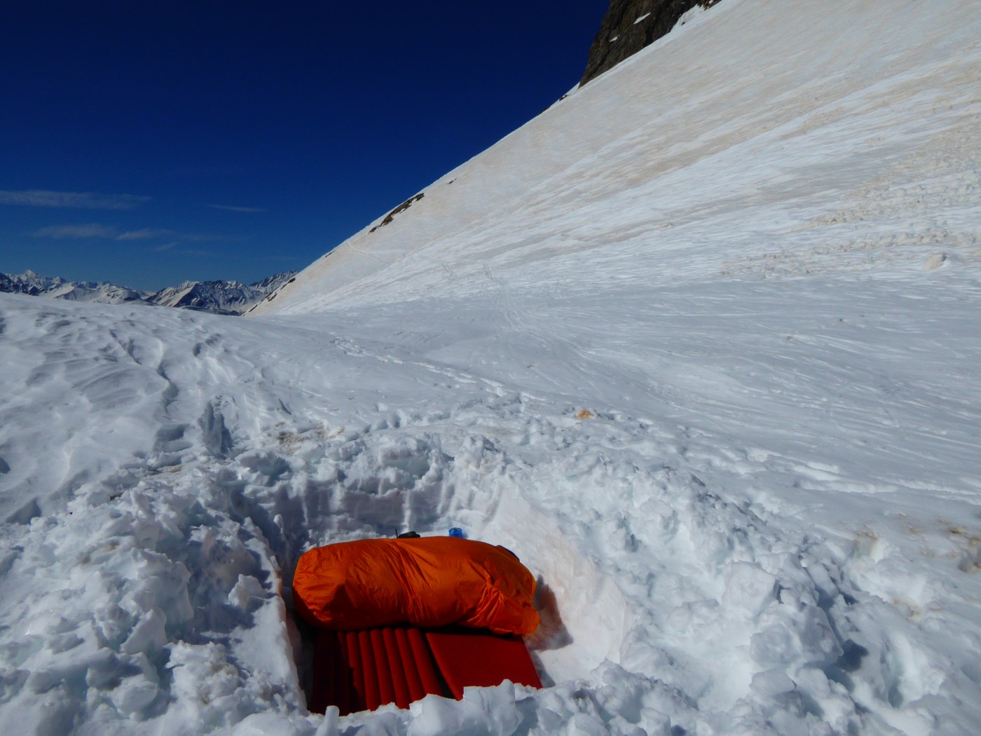 E16 sur deux jours avec nuit au bivouac Fiorio (matelas et couvertures en quantité suffisante). Nous étions 11 (23 places en tout, bivouac + annexe). Descente par la combe des Fonds comme suggéré dans E16 (un déchaussage sur 0,1km pour franchir le torrent) en suivant les bandes de neige en rive droite.