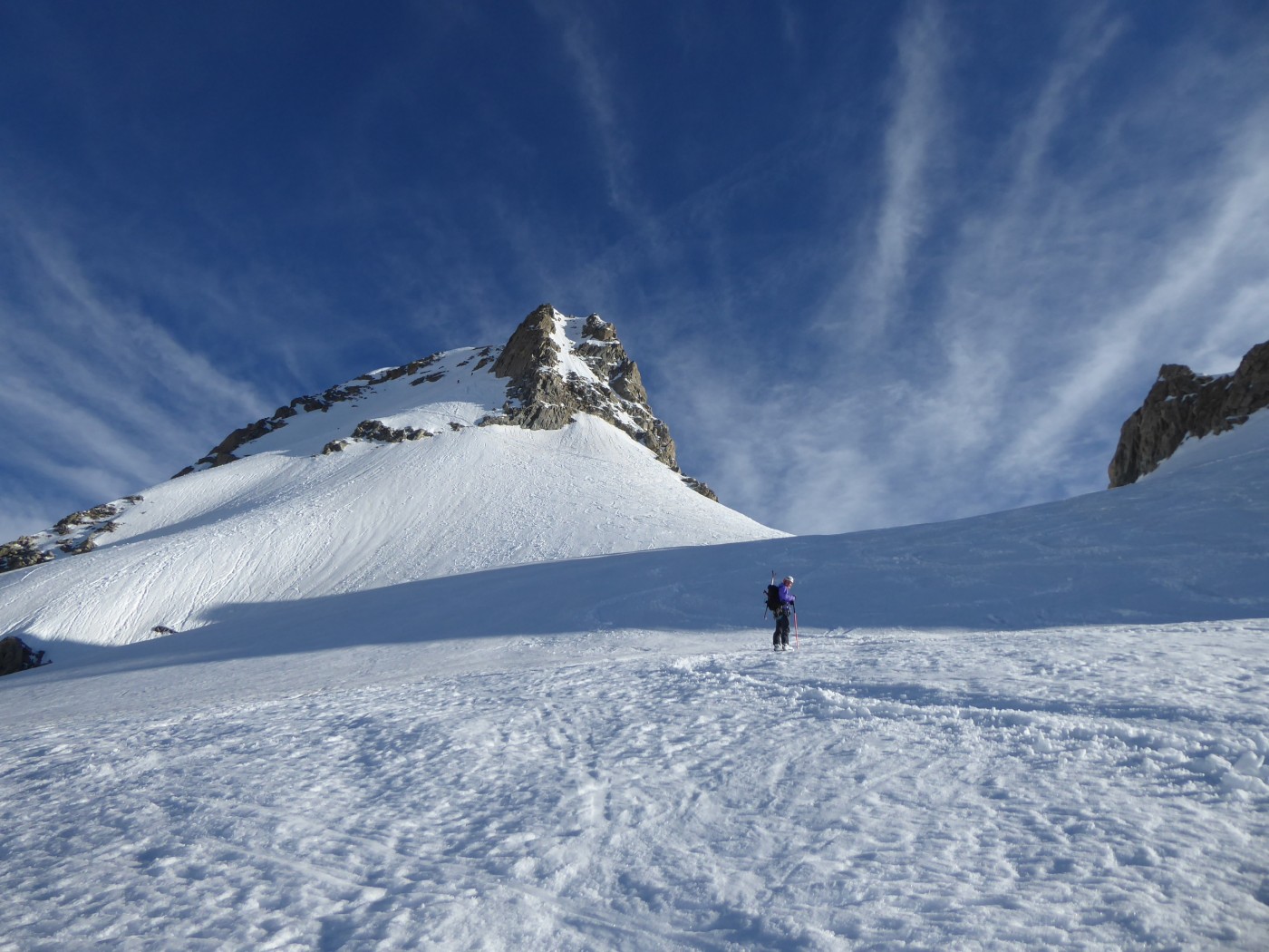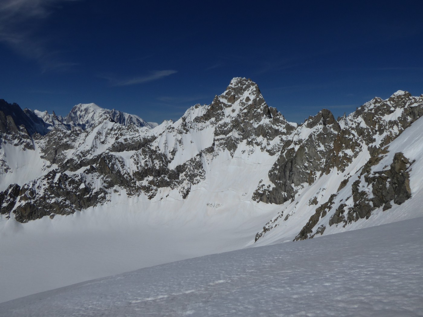 Partis samedi, nous étions avant midi dans la traversée au-dessus du petit col Ferret, ce qui était déjà un peu tard. A la montée au Dolent, nous avons chaussé les crampons pour la dernière pente sous le col où nous avons laissé les skis. La pente finale, en neige dure avec pas mal de boules, ne fait pas très envie. Il faudrait attendre midi pour qu'elle revienne un peu ce qui est tard pour le retour sur le petit col Ferret. Quelques cordées sortaient de l'arête Galley qui parait-il est en bonnes conditions.