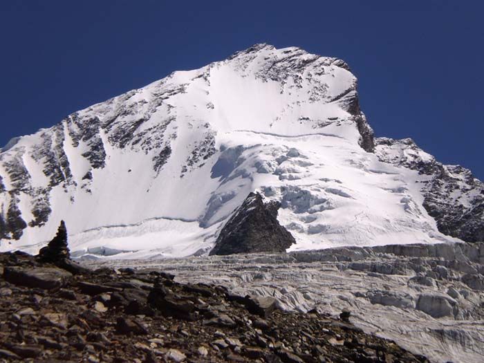 De Randa (1410), montée à la Domhütte (2940). Au point 1534, on franchit le Dorfbach dont on suit la RD, la RG étant dangereuse et exposée aux chutes de pierres. Entre 2370 et 2760, on escalade une barre rocheuse (câbles et barreaux). Avec un gros sac et des skis dessus, il faut de la concentration, surtout le lendemain à la descente. Vers 3135, belles places de bivouac: c'est là que j'ai dormi. On prend pied sur des pentes neigeuses à 3135, on franchit la zone crevassée entre 3250 et 3340 et on quitte le glacier vers 3600 pour monter à la crête du Festijoch (escalade facile au début puis sente de terre et de pierrailles). De la crête, on fait une courte traversée à droite (cordes) pour gagner la brèche (3723 m). Descente de 30m, traversée sous les séracs et remontée facile de la face nord. De la selle entre l'antécime, fin normalement à pied. Descente directe du sommet si en conditions.