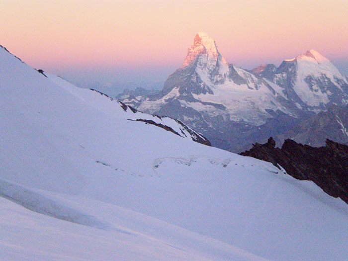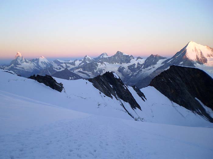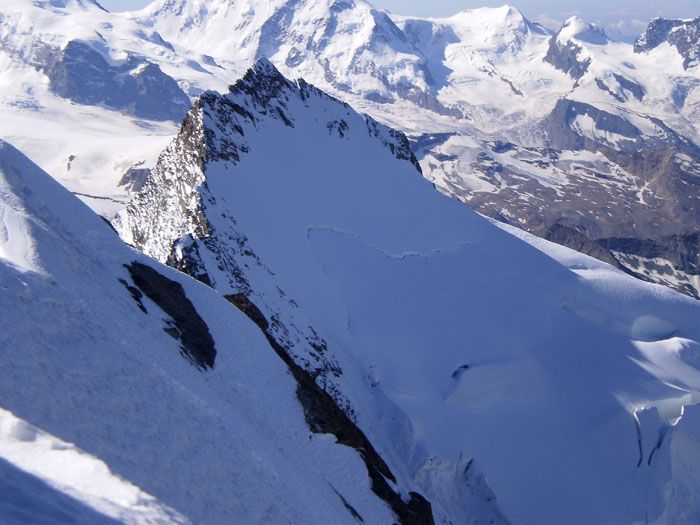 Je ne m'attendais pas à trouver de la si bonne neige dans les pentes sommitales : un vrai régal et assez de pente pour se faire plaisir. Si l'on excepte le franchissement du Festijoch, ski continu jusqu'à 3340 et j'aurais même pu rechausser après les crevasses, mais la neige ne valait pas le coup. 1100 m de ski donc, dont 500 d'excellents et le reste très agréable. Cela rend la descente un peu moins harassante, car la suite avec un très gros sac et les skis n'est pas une partie de plaisir... Refuge plein, donc environ 70 alpinistes, dont 4 au Lenzspitze et 2 au Hohberghorn par son couloir sud mal rempli. La plupart sont montés au Dom par la Festigrat, en excellentes conditions (pas de glace, bonnes marches). Toujours aussi difficile de garer sa voiture en Suisse : je me suis pris une prune de 40 F... Et l'eau n'est pas gratuite au refuge, contrairement à ce qui était dit dans un CR internet.