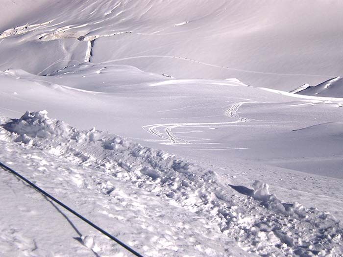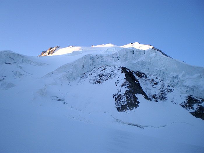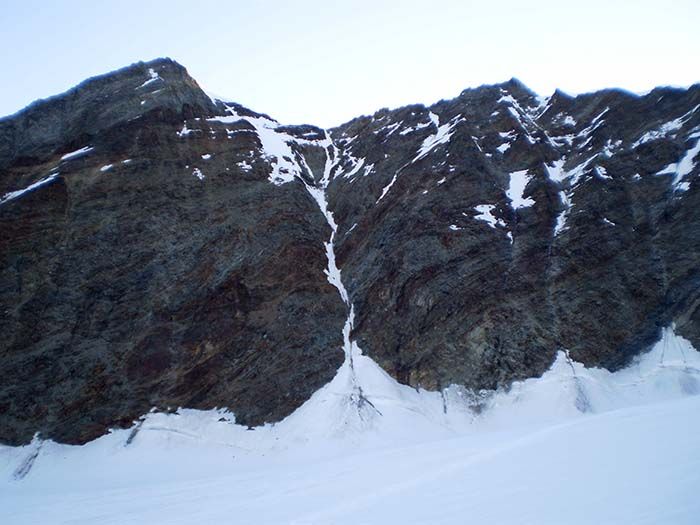 Les chutes de neige de la nuit du 10 au 11 ont apporté une belle quantité de neige au-dessus de 3500 environ, et le vent d'ouest a relativement peu soufflé. Résultat, pas de plaque dans les pentes sous le sommet, seulement un peu de neige roulée mêlée à la poudreuse qui rend la trace un peu pénible à skis car on perd systématiquement 10 cm en posant les posant. Les dix premiers mètres sous le sommet sont en neige très dure, sans être en glace et l'accroche n'est pas mauvaise. Il faut se méfier du passage sous les séracs à 3700, mais la zone exposée est très courte et on la franchit très vite à skis.