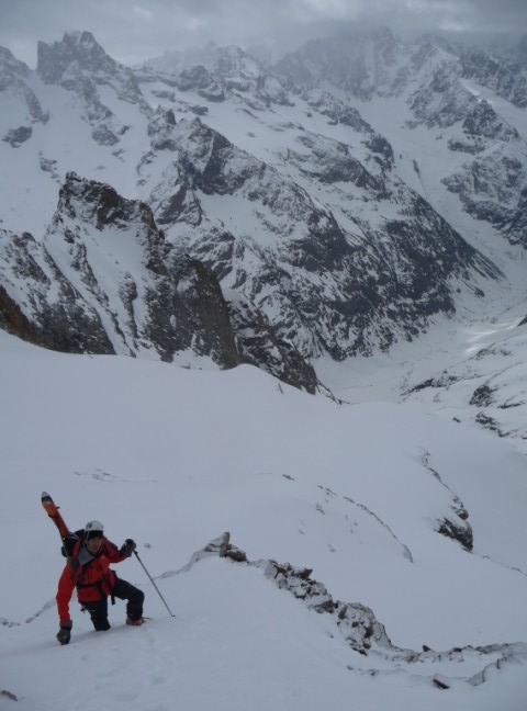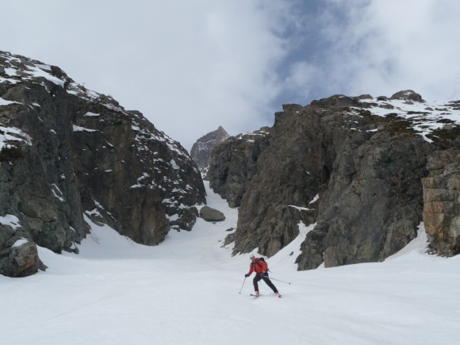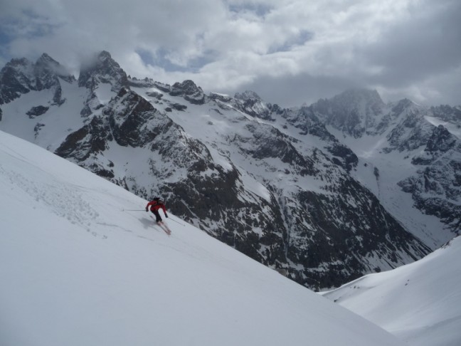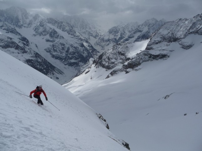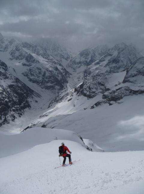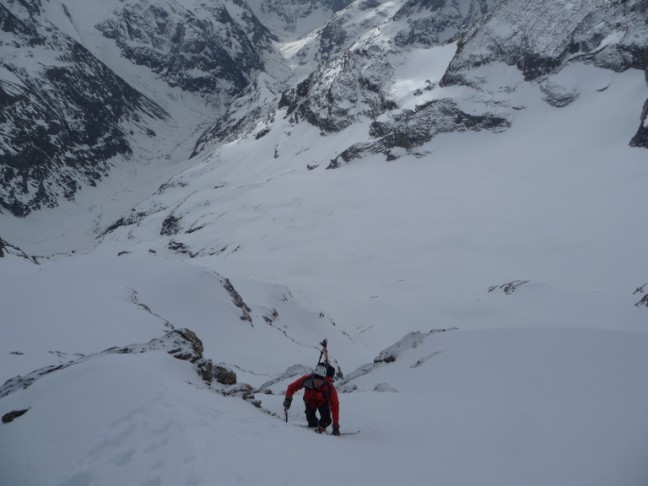 Ca commencait mal : baché à 5h, se découvrant jusqu'à 8h, puis cumulus et alterné. Ajouté à cela peu de regel, la motivation en prend un coup ! En allant au Plaret il y a quelques années, je me suis dit qu'il fallait que je revienne skier ce beau sommet, avec de bonnes pentes soutenue tout le long. A la descente ce fut pour finir du bon ski et nous avons pris le Cros d'Aréna qui était lisse.