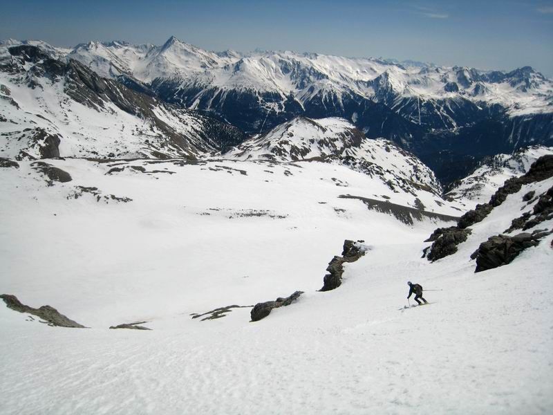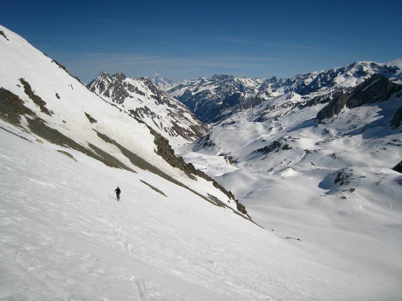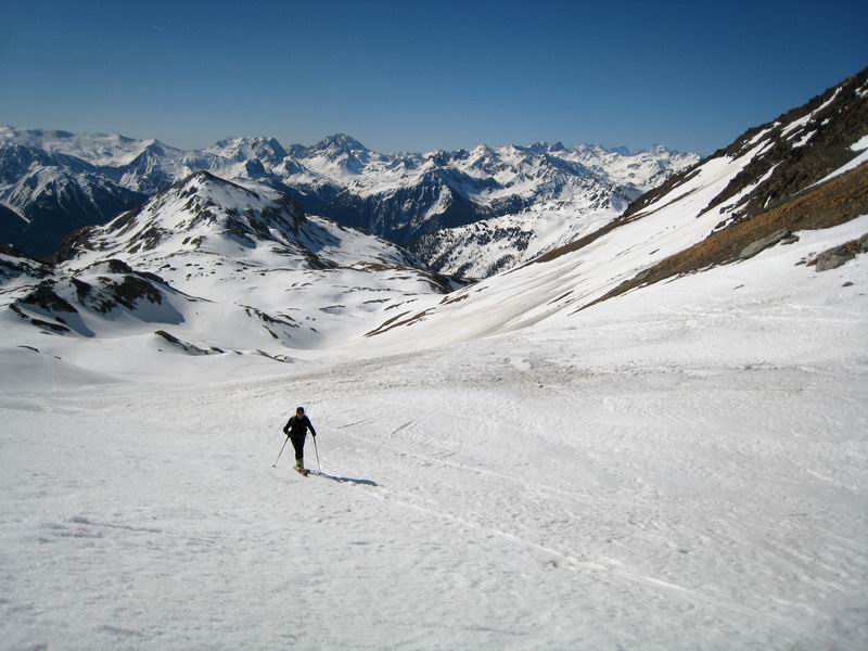 La photo publiée par JIB 8 jours plus tôt m'a remémoré cette face (merci à lui) qui collait pile au cahier des charges du jour : bambée, altitude, un peu de pente, abritée du vent. Bonne pioche à tous niveaux même si le vent était bien présent en particulier dans la combe du Grand Planay, mais au moins on a fait du super ski jusqu'à 2000m (enfoncement max 5cm à 15h plein sud). Mis à part un guide et son client croisés dans la face (venus de ValTho), on a vu personne
