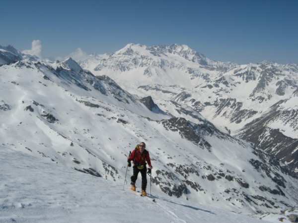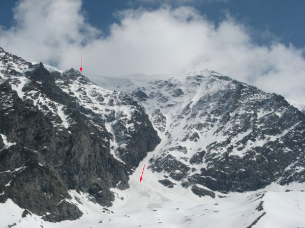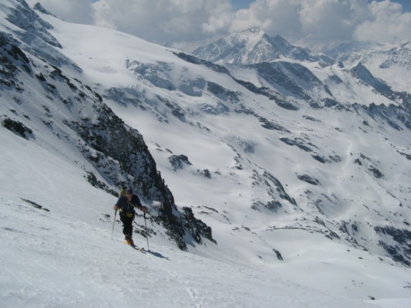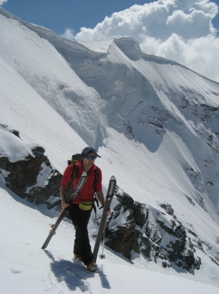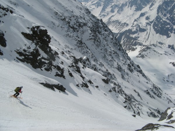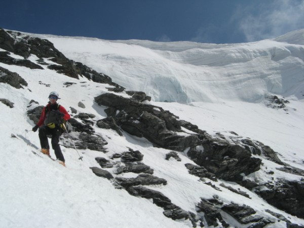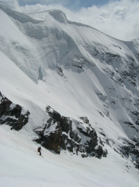 Tout d'abord une photo de Véloski qui donne envie. Puis pas envis de se lever tôt après un mariage (félicitation aux jeunes mariés, manu et bénédicte !) on opte pour cette boucle avec une montée paisible sans se presser au soleil sans crampons/piolets (passage sous le couloir avec repérage de celui-ci). Descente en super condition à 14h30, bien décaillée, mais descendue en 10 minutes pas très sereins sous ce sérac de 30 m de haut ! Question pente : 45°/200m, 40°/400m mais exposé sous le sérac. Nous déconseillons de remonter cet itinéraire, mais être sur des conditions pour le descendre à vu. Une descente de grande ampleur avec ambiance sous le sérac.