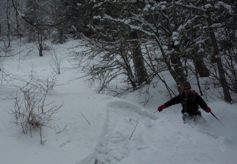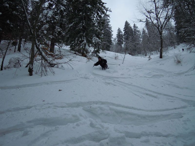 En forêt neige toujours poudreuse mais moins légère, réchauffement oblige, que les jours précédents. Du coup le relief sous-jacent est moins sensible, c'est presque mieux pour la qualité du ski.