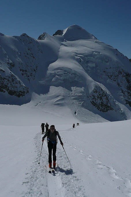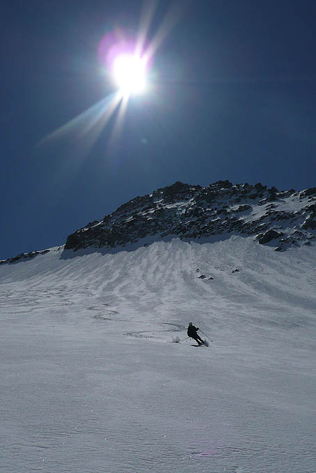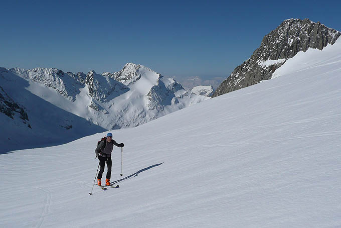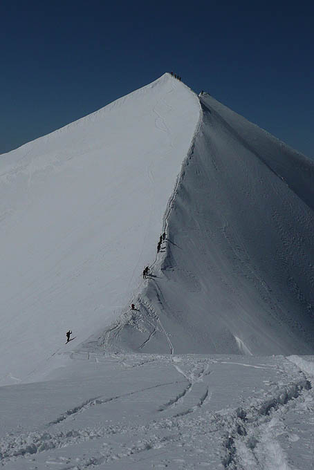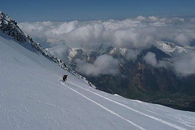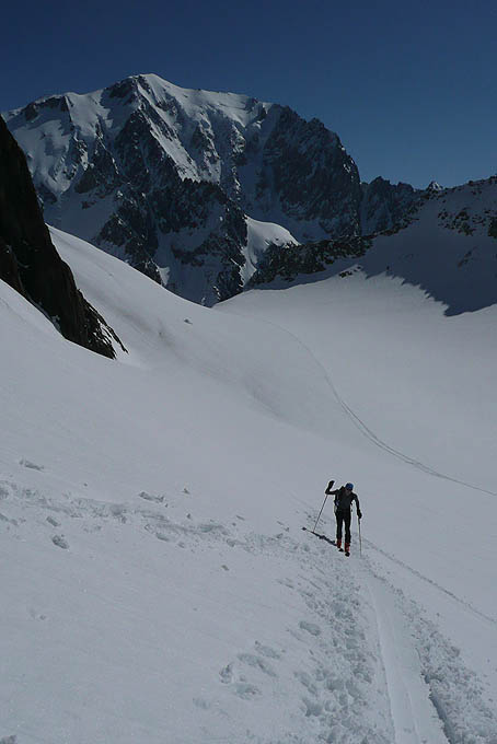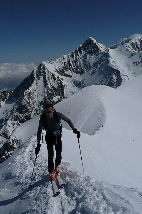 Thibaut voulait une grande course d'altitude avec du dénivelé. De mon côté, c'était l'occasion de parfaire la forme et l'acclimatation sur ce magnifique belvédère dominant de 2500 m le val Monjoie. Légère tension quand nous chambrons gentiment un groupe déposé en hélico au col Infranchissable (et facilement doublés alors que nous avions plus de 2000 m dans les pattes). Non seulement une éthique de la montagne qui n'est pas la mienne mais surtout le culot de mépriser ceux qui, bien qu'un peu moqueurs, étaient partis d'en-bas le matin même. J'en suis presque venu à regretter d'avoir informé de la présence d'une crevasse un des membres de ce groupe qui y allait droit dedans la tête baissée. L'occasion ici, non pas d'un nouveau débat sur "oui ou non à l'héliportage" mais sur la légalité de cette dépose qui, si l'on en croit la carte IGN, ne peut se faire que sur le versant français du col Infranchissable (et serait donc interdit). Fort heureusement, une autre rencontre fut plus sympathique avec un tandem parti également des Contamines et avec qui nous avions une vision de l'activité ski semble-t-il très proche. Bien le bonjour à ces deux "collants-pipettes".