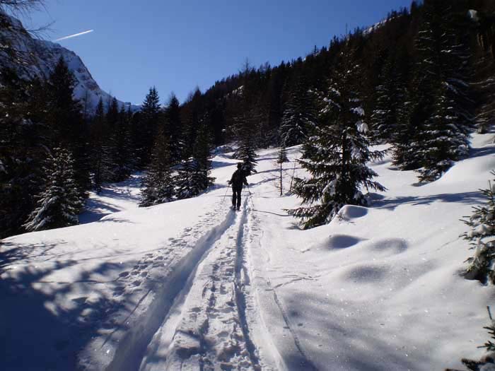 Sortie superbe, conditions idéales. Nous voulions aller jusqu'au col, mais il aurait été plus pratique de monter par les pentes sud-est d'accès au col 2434. J'avais dans un coin de la tête l'idée de descendre le couloir ouest puis de remonter au collu entre les deux cols, mais les conditions ne m'ont pas paru excellentes : sans doute du cailloux dans la partie basse et neige soufflée. La route forestière est interminable, surtout quand on part de tout en bas, mais il y avait heureusement une bonne trace laissée par le passage d'un quad à chenilles utilisé par des techniciens de maintenance de l'émetteur wifi au carrefour de la piste des Vieux. 4 skieurs nous ont précédés et nous les avons retrouvés au col N la Pierre. Ils sont descendus de là. Deux autres skieurs au col la Pierre, montés par l'ouest. Très bonne neige sur la piste des Vieux, vierge de tout skieur.