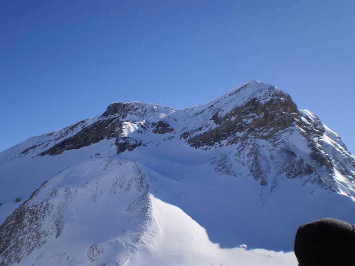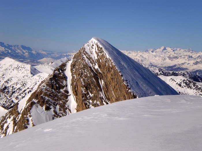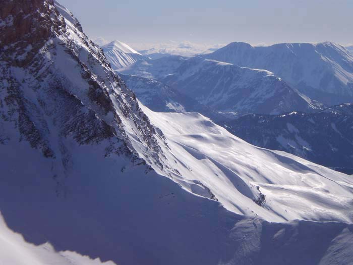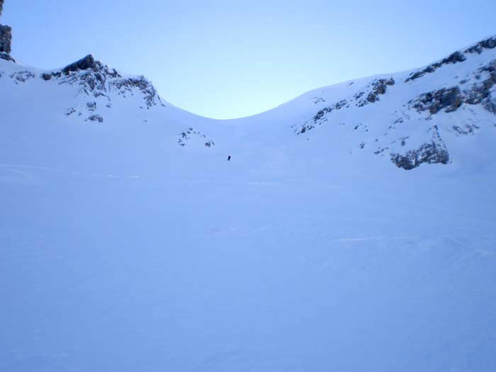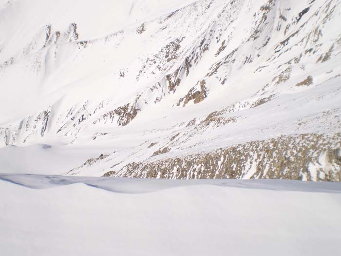 Les deux passages à aborder avec prudence sont les 100 m à 35° en haut de l'Encoungoura et les 100 m idem entre 2100 et 2000. Le départ est un peu soufflé, mais ça tient et un peu de vent de sud-ouest a transporté un peu de neige. Dès qu'on est au creux du vallon, la neige est assez stable et on ne déclenche aucune coulée. Ça glisse un peu plus sur fond dur dans la deuxième pente soutenue, légèrement plus raide avec un goulet étroit et un peu venté. De nombreuses plaques sont parties spontanément des crêtes et des cols, formant des coulées peu épaisses qui ont dû stabiliser un peu le manteau. Mais il reste beaucoup de neige susceptible de bouger, corniches, etc., notamment sur les versants raides qui dominent l'Encoungoura.