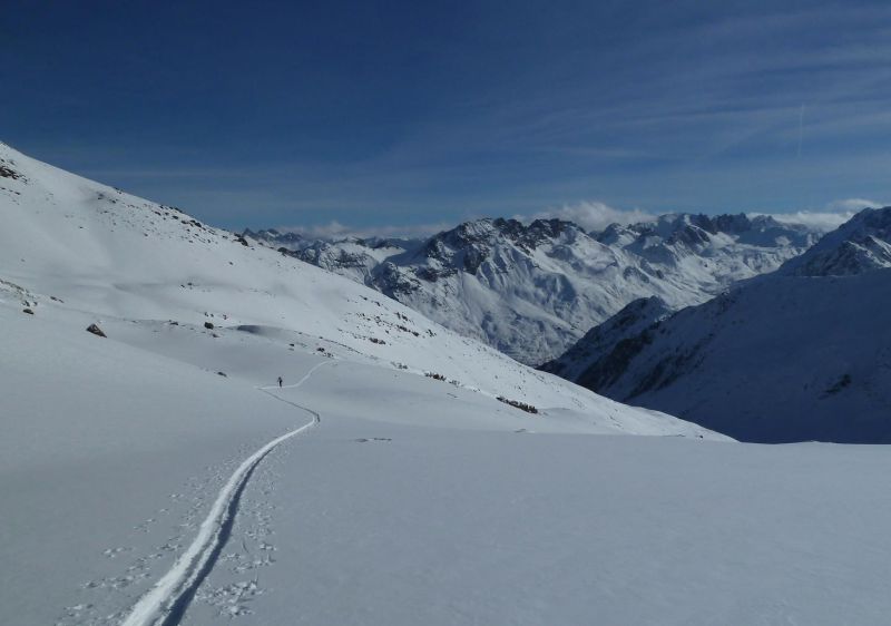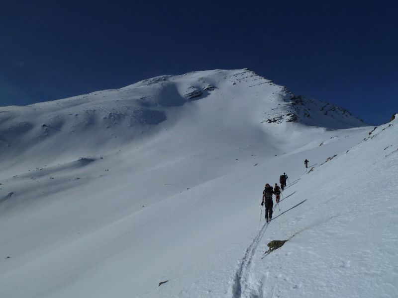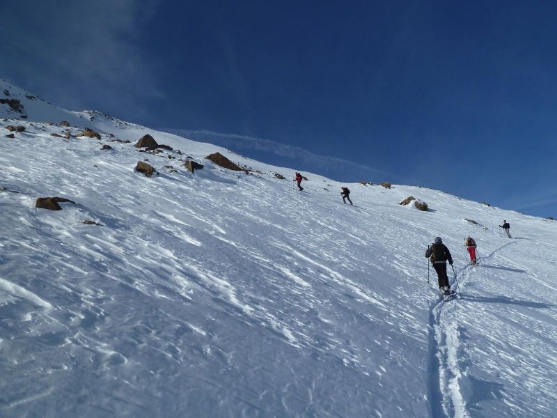 Le vent de sud a travaillé en altitude, dégarnissant (mais pas totalement) les versants sud au profit des versants plus abrités, telle que la combe est empruntée ce jour. ça ne paraît pas si répugnant, mais la méfiance est de rigueur dans ces versants.