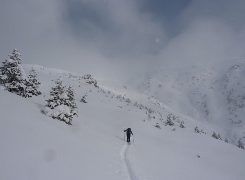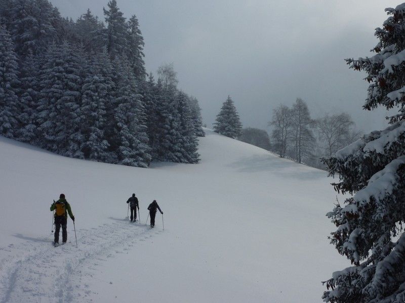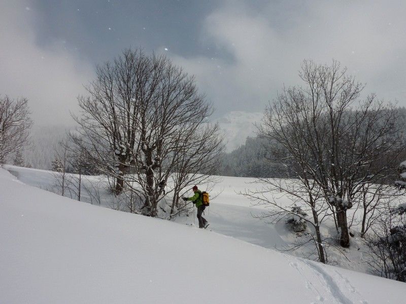 Départ des Mazoirs par C6.2 du nouveau topo ART. Au début ça va puis rapidement la forêt devient trop dense. On a déchaussé pour traverser vers la droite et retrouver les pentes plus accueillantes au dessus du Pay (C6). Arrêt sous la crête vers 2100, vent un peu de brume et neige de moins en moins sympa (dense puis franchement cartonnée par le vent). Retour à la route en passant par le Pay.