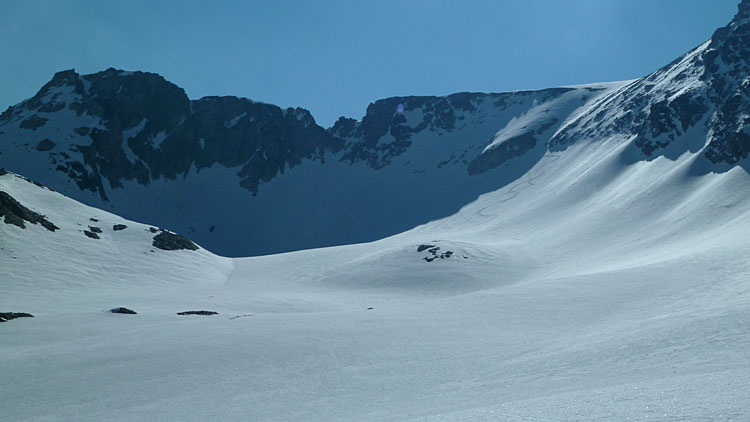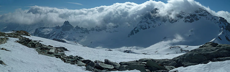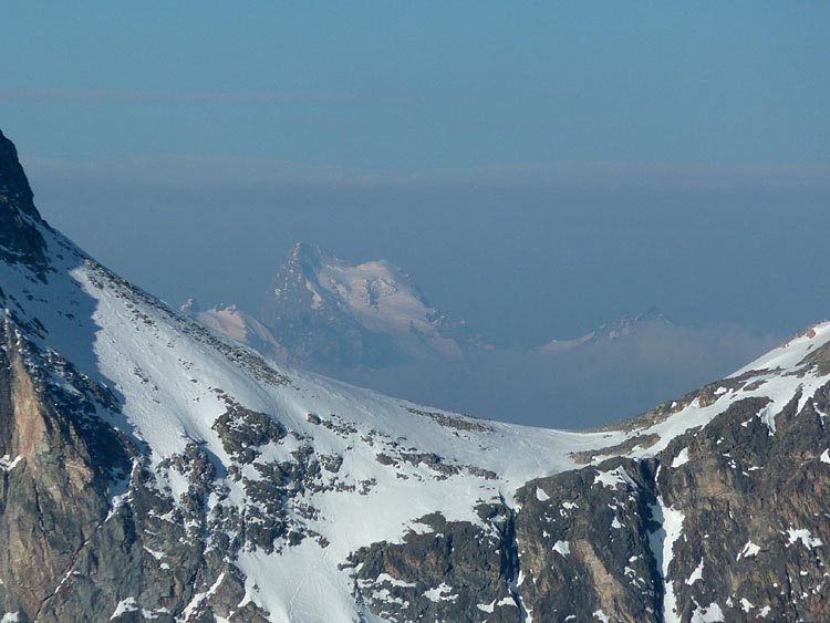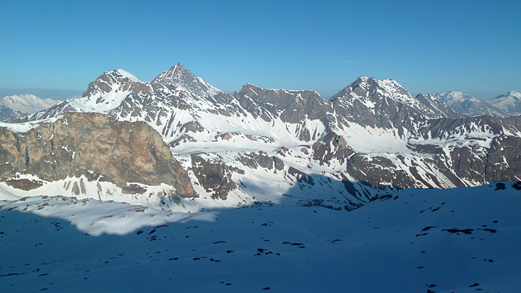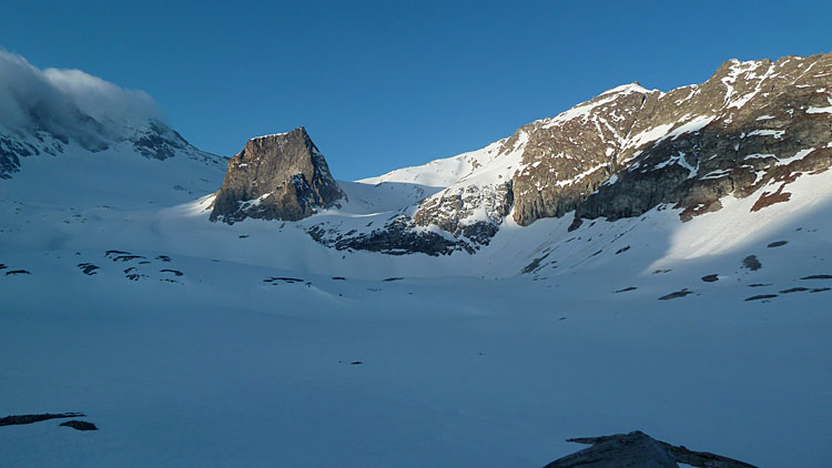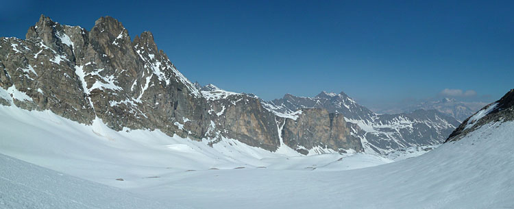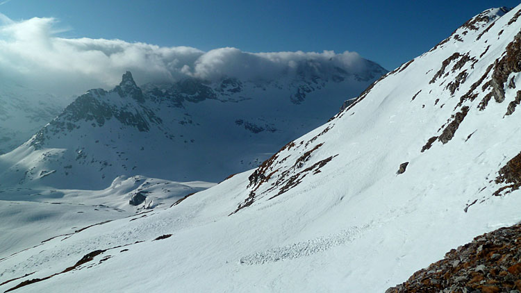 Je me suis rabattu quelques centaines de mètres plus à l'ouest ou le ciel est resté dégagé toute la matinée. Très beau voyage avec une jolie descente sur le "feu" glacier d'Etache le long des Rochers Cornus puis du Grand Bec d'Etache.