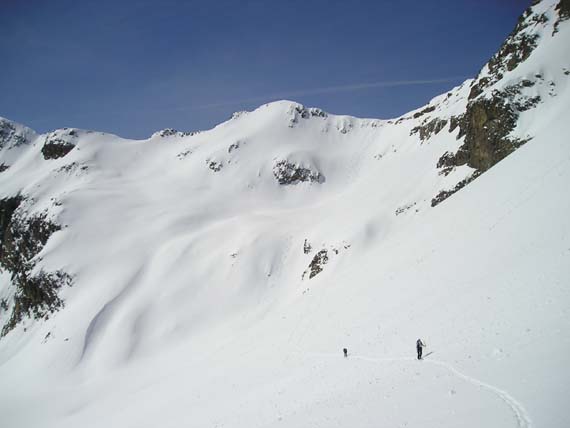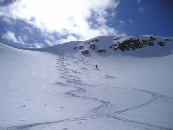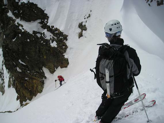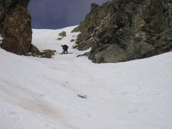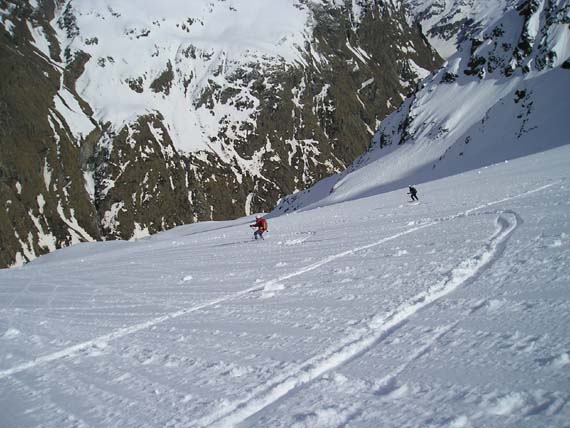 Sortie du couloir (partie à 50°) en transfo irrégulière avec un peu de neige dure, poudre molle. Une étroiture de la largeur des skis en défend l'accès et met bien la pression pour de début de la descente. Combe du veyre :Extra à skier (comme de la poudre) même à 15h00.