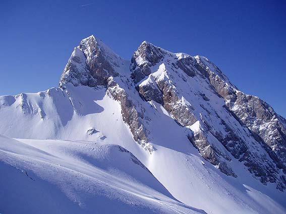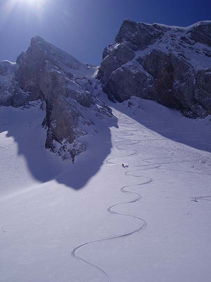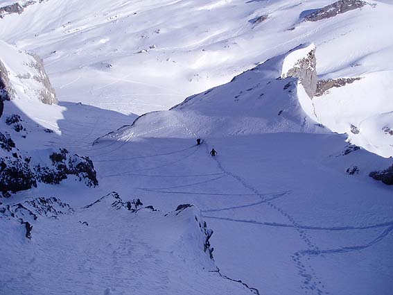 montée I25, traversée et descente sur Comburce grâce à Guillaume, rencontré dans le couloir à la montée avec qui nous avons fait la course et qui a assuré la logistique auto-stop jusqu'au col des Aravis. Pour I25, il n'y a pas de 45°, tout au plus un pass. à 40° à la sortie. La pente est plutôt à 35°/300. En revanche, la cotation est bonne. pour le couloir Combaz, c'est un vrai 5.1 (même sans le passage merdique) avec presque 100m à un vrai 50°. En revanche, en-dessous, ça tombe tout de suite à 40° ; on remonte ainsi les 2/3 du couloir en peaux.