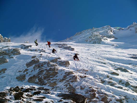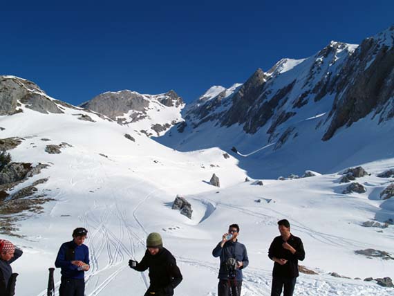 Très bon enneigement. Quelle surprise par rapport à la sortie dans Belledonne de samedi où la brèche du Replomb nous avait gratifiés d'une mince poudreuse sur fond bien dur (passage de la pluie). Dans les Aravis, la couche de neige récente est suffisament importante pour que l'on fasse du très bon ski dans la poudreuse dans les endroits protégés ; sinon dans la combe sommitale, c'est transformé.