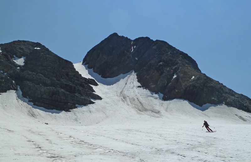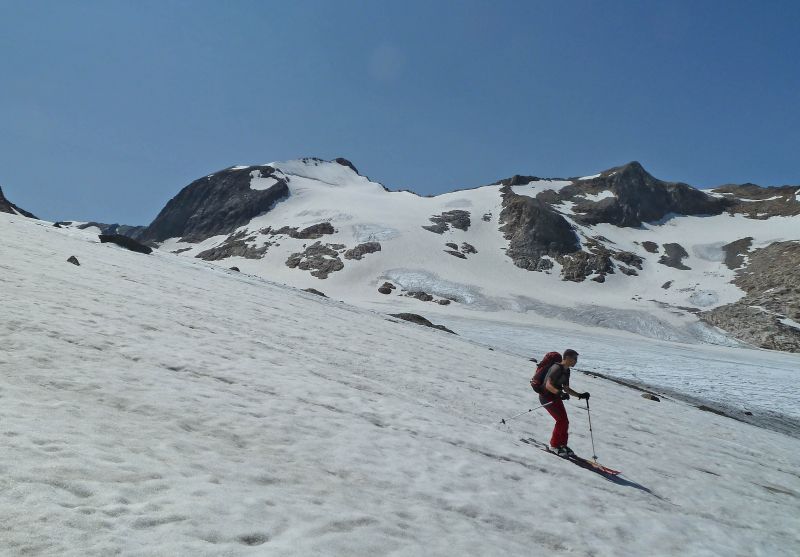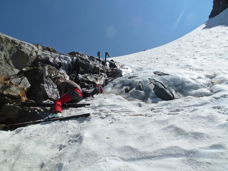 Nombreux piétons sur l'itinéraire jusqu'au pied du glacier, et une cordée de 3 croisée sous le sommet, à laquelle nous avons poliment refusé de céder nos skis...