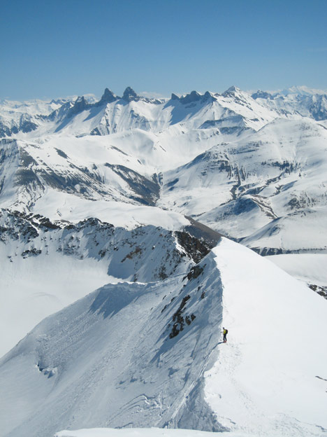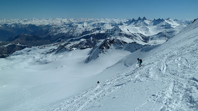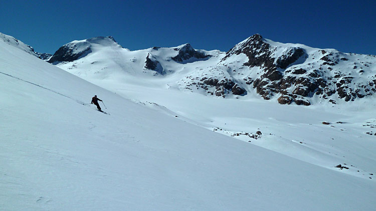 deux télésièges -> traversée au-dessus du lac Bramant et vn de l'etendard -> 2750 -> cime de la valette -> descente sur Rieu blanc -> remontée sous genepy -> mollard -> balme -> pistes. D+/- : 1350/2350 (dont 1950 hors-pistes).