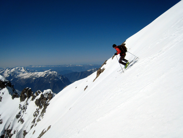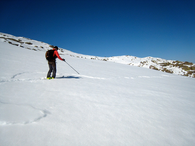 objectif : pas de portage, pas de pentes intermédiaires (orientation et inclinaison) et commencer à globuler. Dans l'ensemble assez bon avec skis mi-larges (86 et 90).Vu la chaleur nous n'irons pas au Sauvage.
