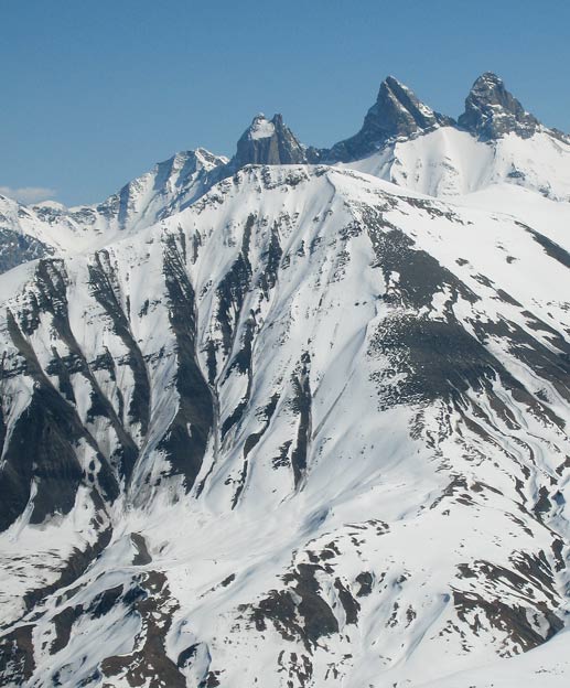 la neige est restée sèche au-dessus de 2900 m en nord-est.On note un léger carton de surface et deux autres faibles croutes intercalaires. Ailleurs, chauffée à pourrie jusqu'au fond. Sur le plat vers 2500 m la neige s'affaisse et se lézarde très loin du passage du skieur, signe de possibles reptations à venir dans les pentes non purgées.