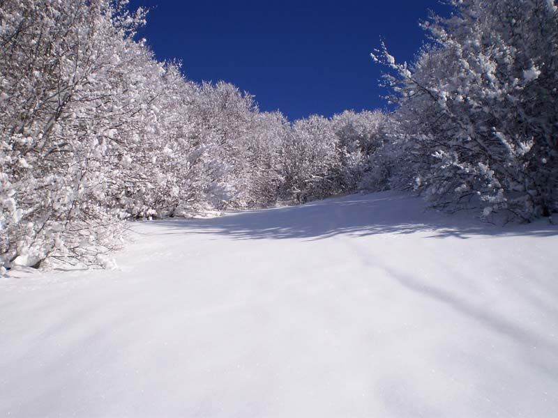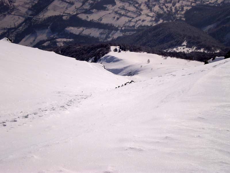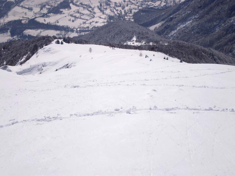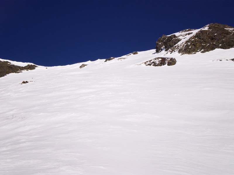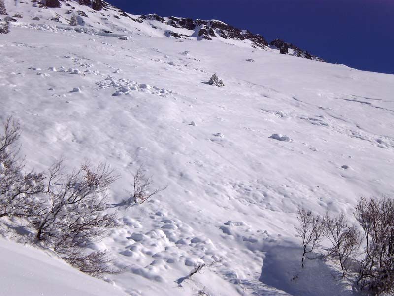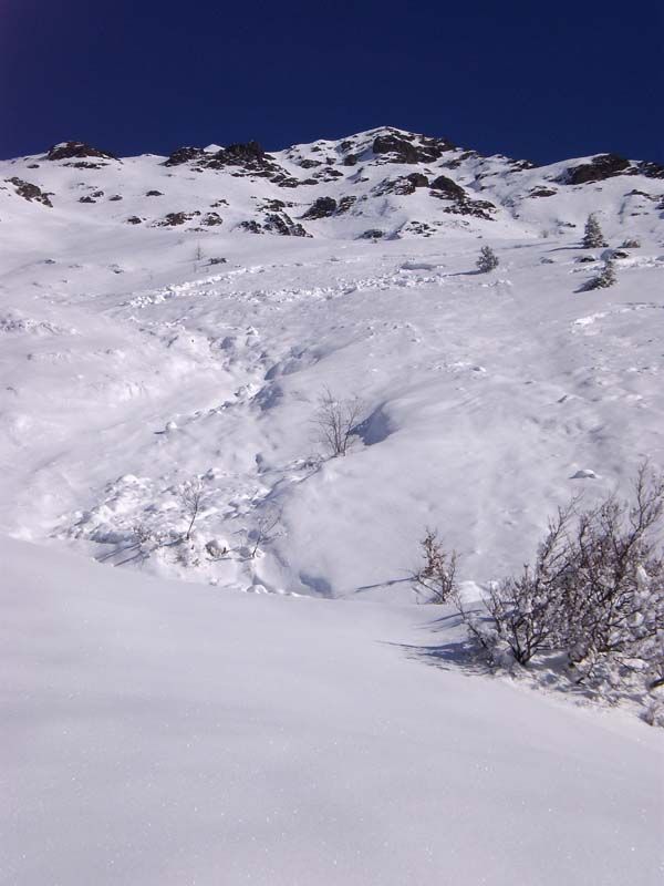 Conditions un peu atypiques pour une course qui ne l'est pas moins... J'étais venu explorer ces pentes le 27 décembre dernier et j'avais dû faire demi-tour vers 1700 m devant le spectacle de nombreuses avalanches parties à cause des cassures du terrain. Je savais que la neige récente allait recouvrir tout cela, mais je savais ce qu'elle cachait. La traversée entre 1750 et 1800 n'était donc pas bien risquée, à midi tout du moins. À la descente, j'ai préféré emprunter les pentes plus au nord, orientées SO, mais la neige, légèrement alourdie par l'humidification, partait en coulées sous les skis dès que la pente s'accentuait. En faisant attention, ça passe très bien, mais c'est toujours impressionnant... Cela m'a valu des pentes bien dures par endroits et un étroit goulet raide et tournant bien lessivé. Cramponnage à skis puis échappée pour regag