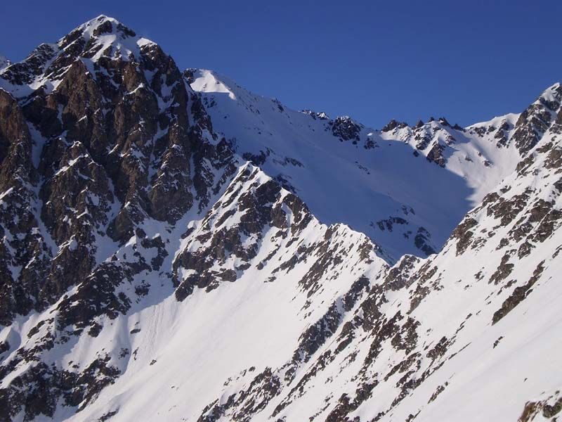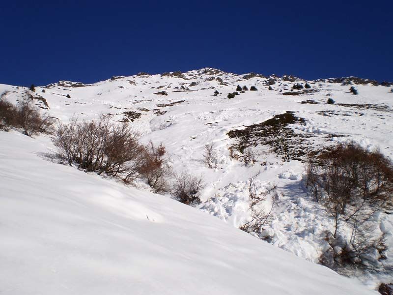La voiture ne veut pas démarrer : qu'à cela ne tienne, je pars à pieds de la maison... pour skier ce sommet qui est, avec la Cavale, à la naissance du chaînon Coiro-Armet. On peut chausser les skis vers 900 si on ne répugne pas à caresser les cailloux. Par contre, à la descente, j'ai déchaussé à la première touchette vers 1250. Et j'ai même chaussé les crampons afin de ne pas batailler en permanence pour maintenir mon pied aval sur le sentier. J'ai dû m'arrêter vers 2120 m (même si mon alti m'en indiquait 100 de plus !) car j'avais trop pataugé dans une neige assez alourdie par l'humidification : crampons, skis, re-crampons pour sortir le couloir en neige dure... fatigue, heure tardive... Demi-tour. J'ai choisi de descendre sur des pentes plus ouest pour profiter d'une meilleure neige et ce fut 500 m (40° / 150 puis 35-40) de belle poudre sur fond dur. Cot 4.1 / F+ / E1 (pente 45° pour finir).