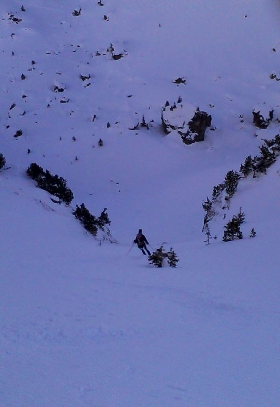 L'enneigement s'est bien amélioré sur ce secteur. Les quelques cm de neige fraîche font plaisir à voir. En revanche le fond dur est bien présent jusqu'à une certaine altitude puis ensuite c'est fond mou (vers 2100 environ) en face ouest de la Botte, qui elle n'avait vu qu'une trace avant notre passage à la différence de la face est du Grand Eulier, presque ravagée.