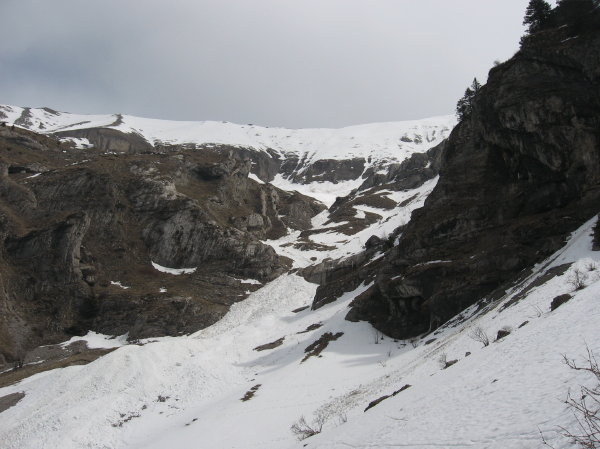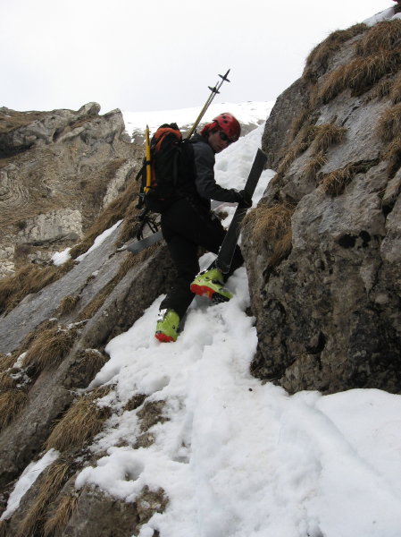 Face N de l'Evêque pliée en quelques virages! c'est trop court. Face W Evêque moins bonne mais heureusement que les cumulus ont empêché le dégel sinon nous aurions eu droit à une croute cassante sur pourrie. Bien choisir son couloir (repérable depuis la route Saint sébastien-Mens) pour passer les plis inférieurs du rideau. Le passage de la barre-cascade vers 1700, s'est fait à pied rive gauche par un petit goulet de 30cm de large et 2m de haut en neige.