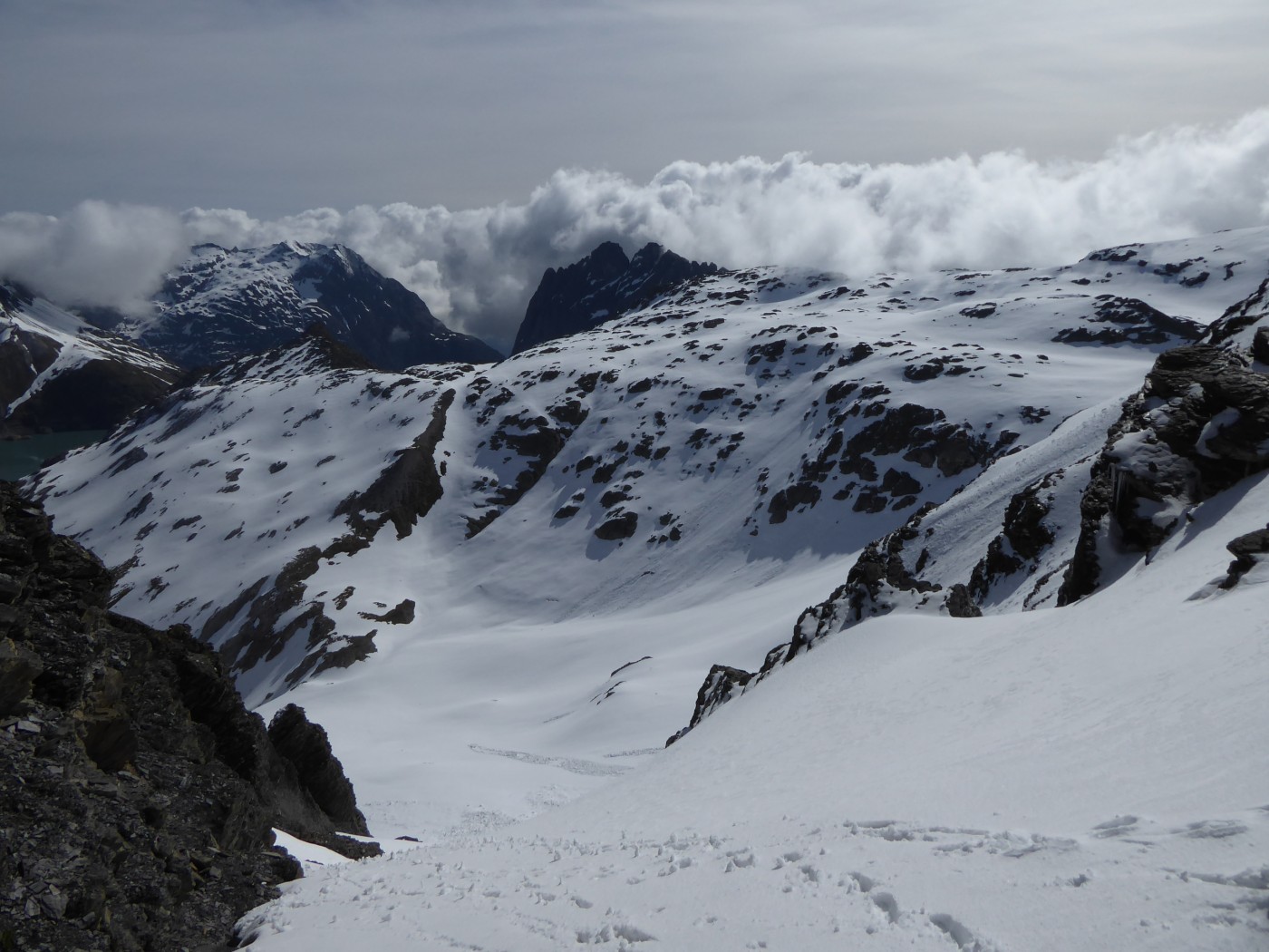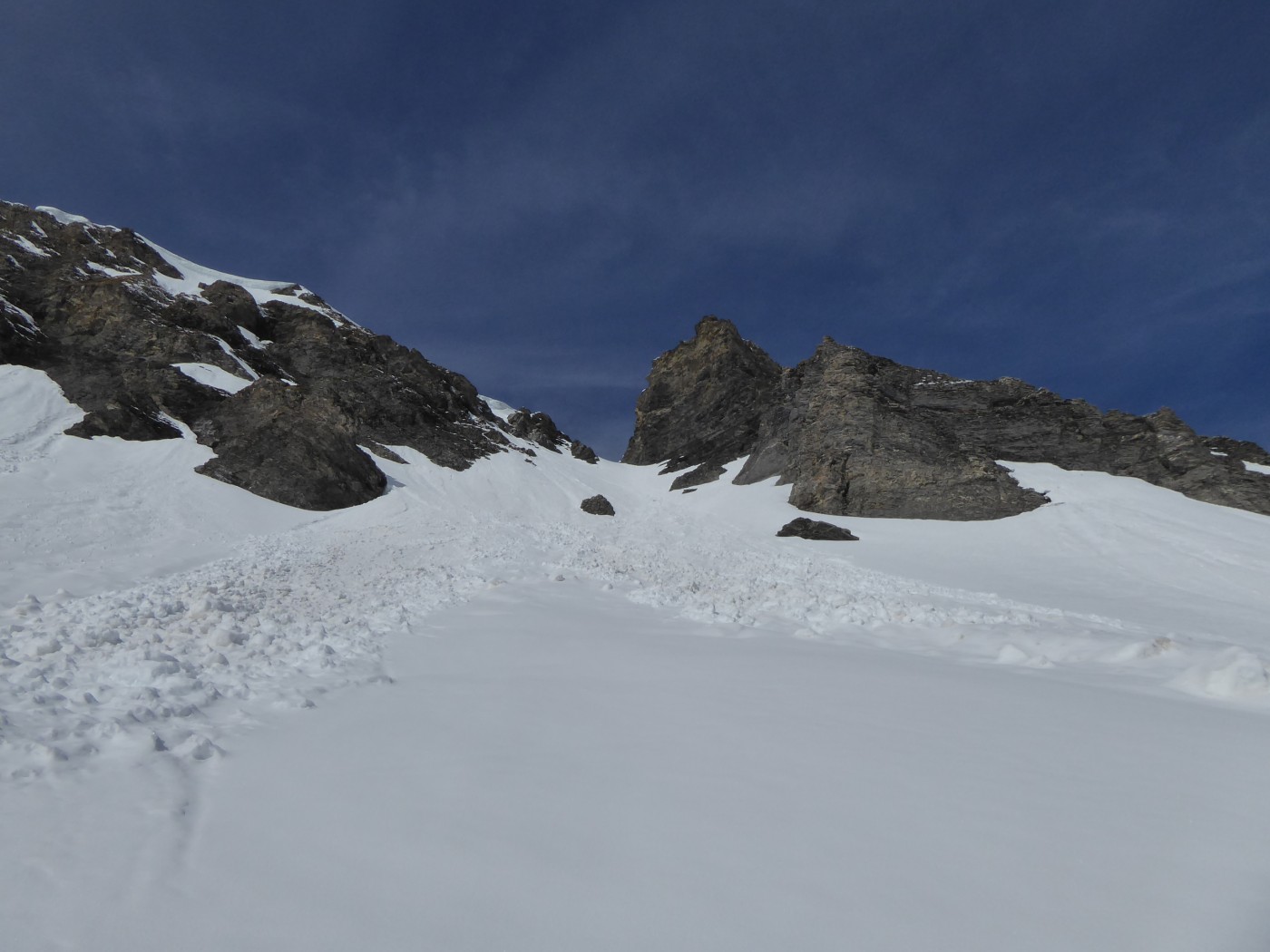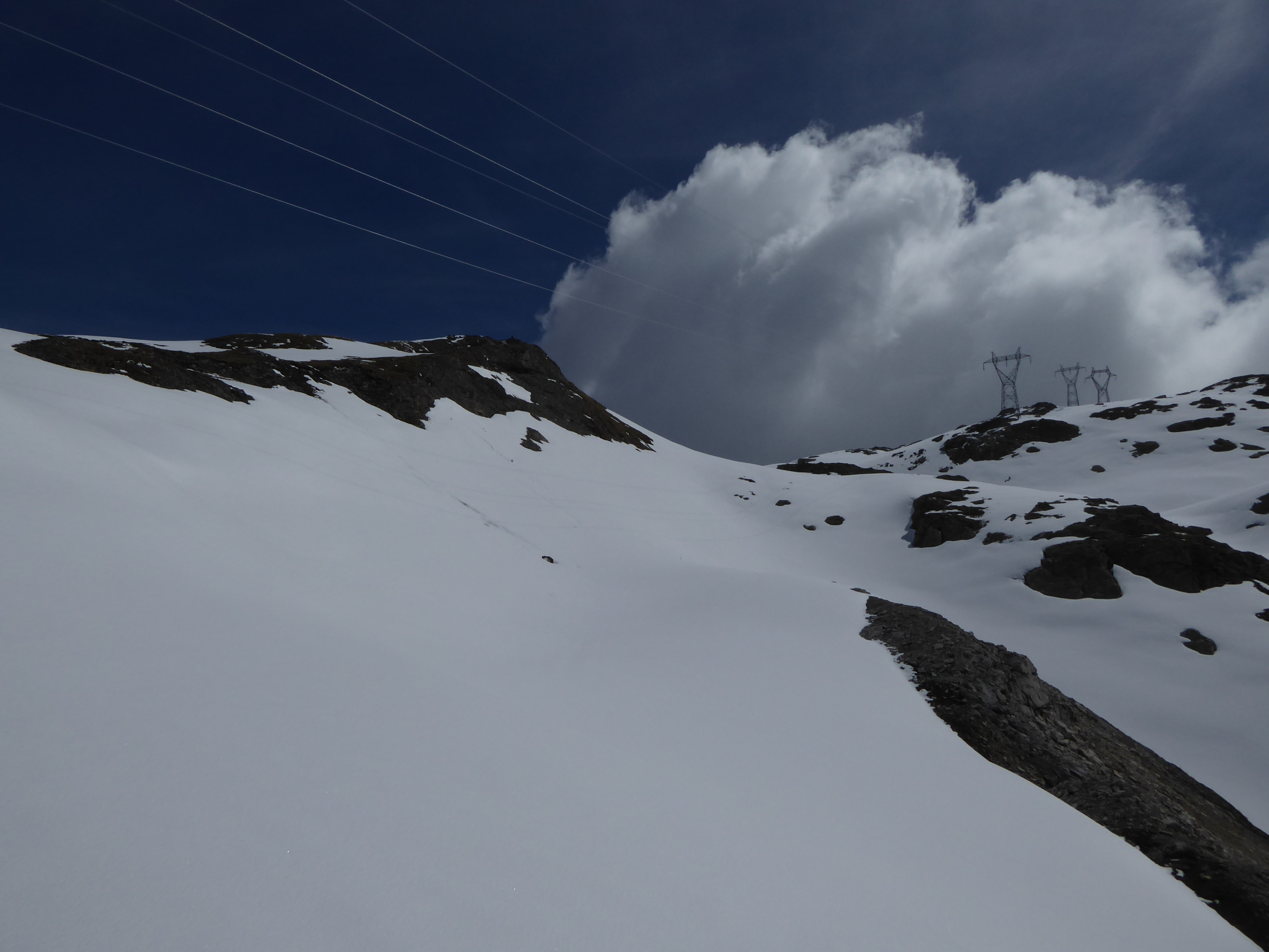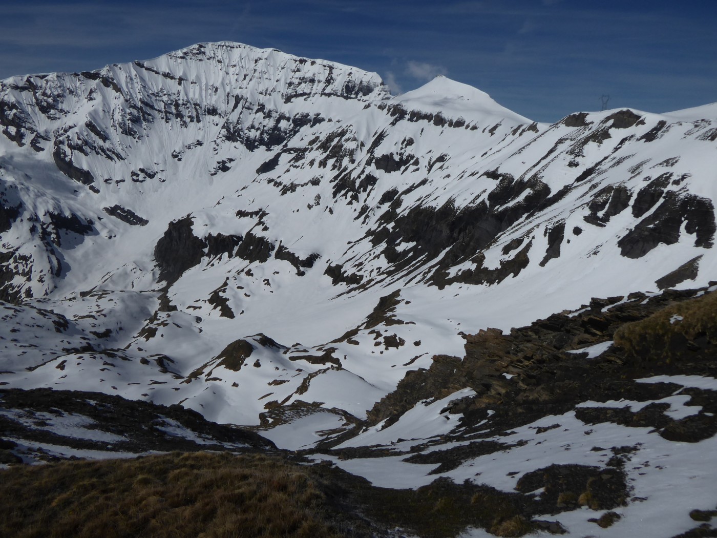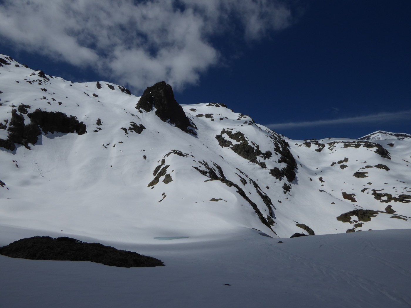 Jolie combinaison dont la partie Eves-Corbeaux permet d'évoluer en marge des grandes classiques du secteur (Cheval Blanc et Terrasse). On chausse sur la route 0,1 km après le barrage. La descente versant SO de la pointe à Corbeaux (E) était moins enneigée que quand je suis passé {{[l'année dernière->https://www.volopress.net/sortie6383.html]}}. Je suis descendu depuis le débouché du couloir NE qui était bien enneigé.