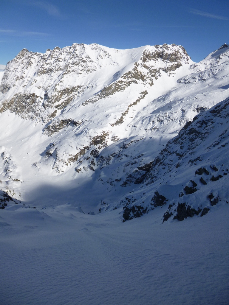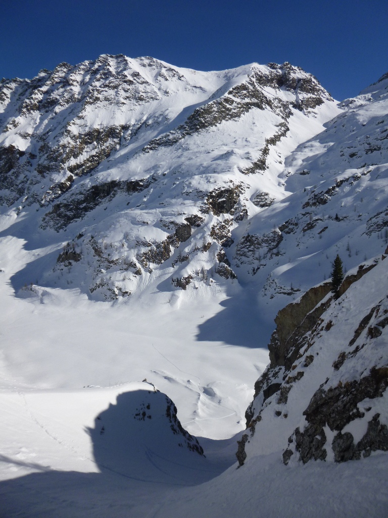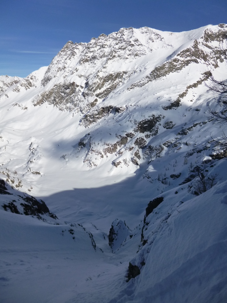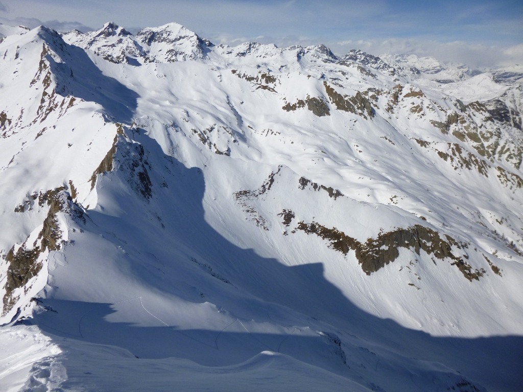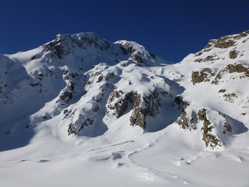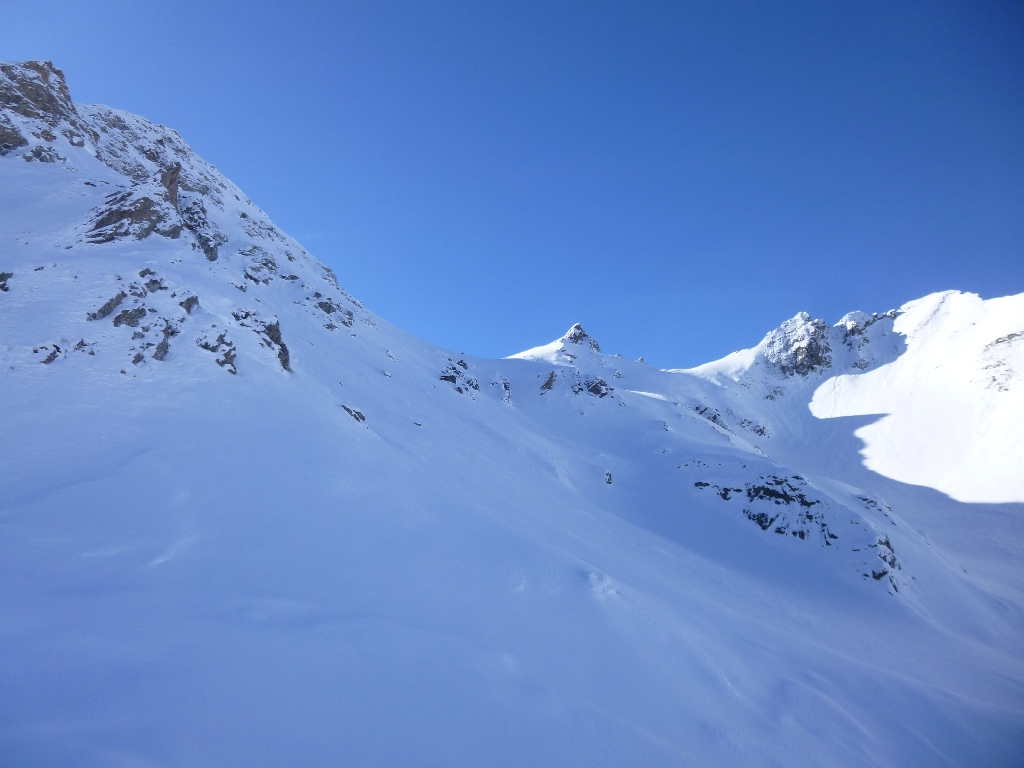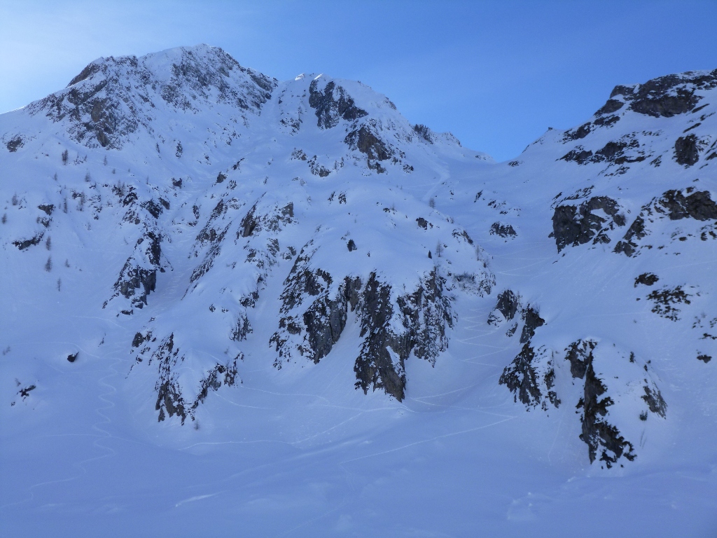 Deux beaux itinéraires que j'avais remarqués lors d'un repérage estival. Le couloir NE de la Facciabella fait 500m de haut et présente deux sections à 45° (sur 100m en tout). La NO de la Fricolla est moins raide mais très agréable et esthétique à skier.