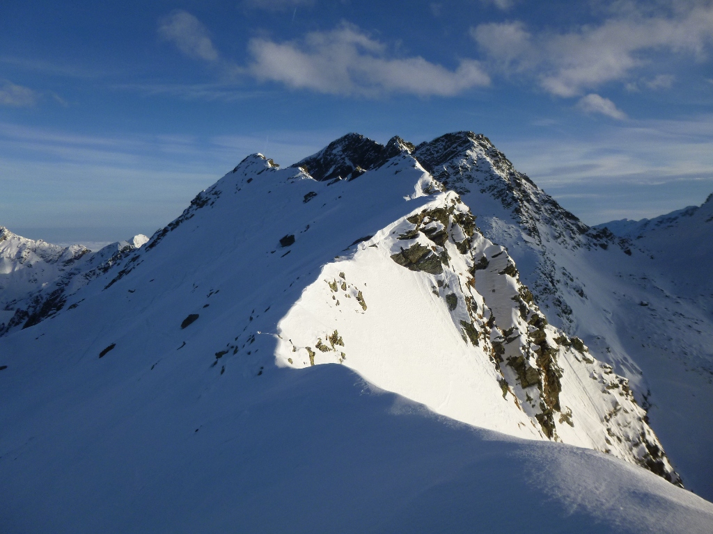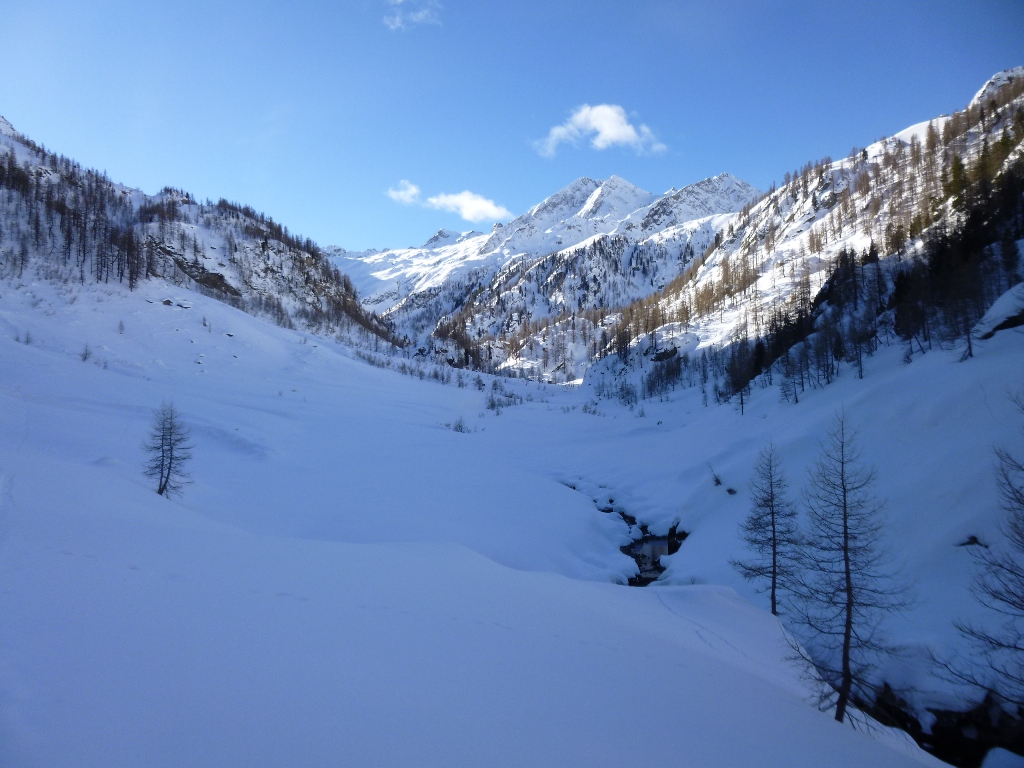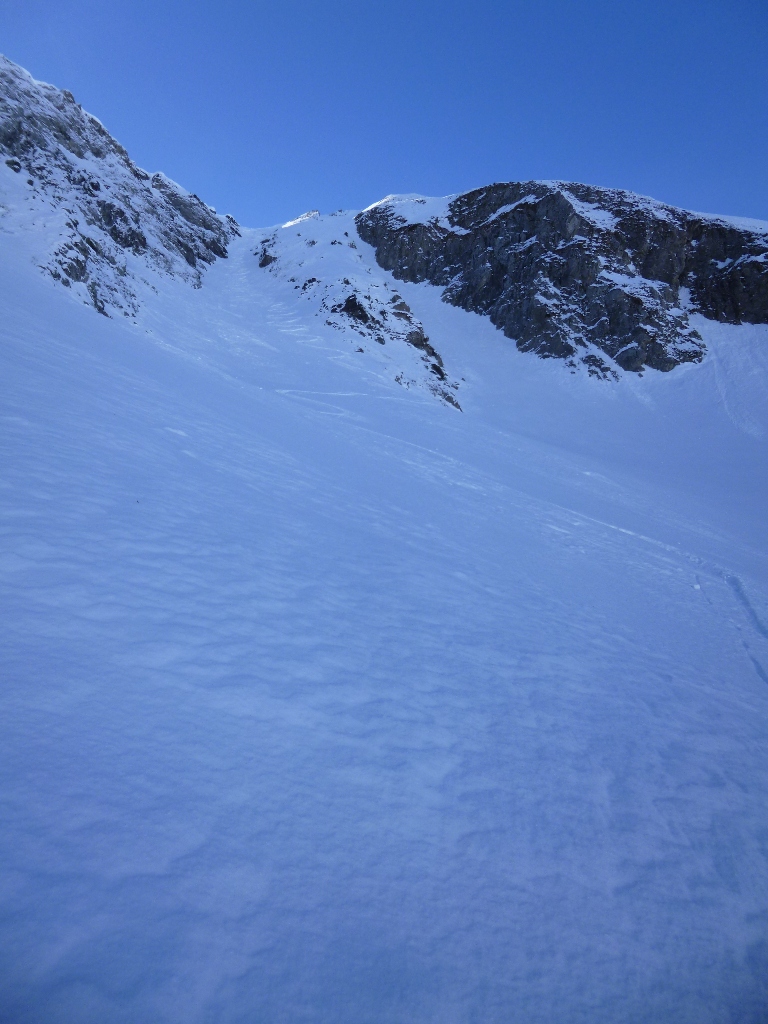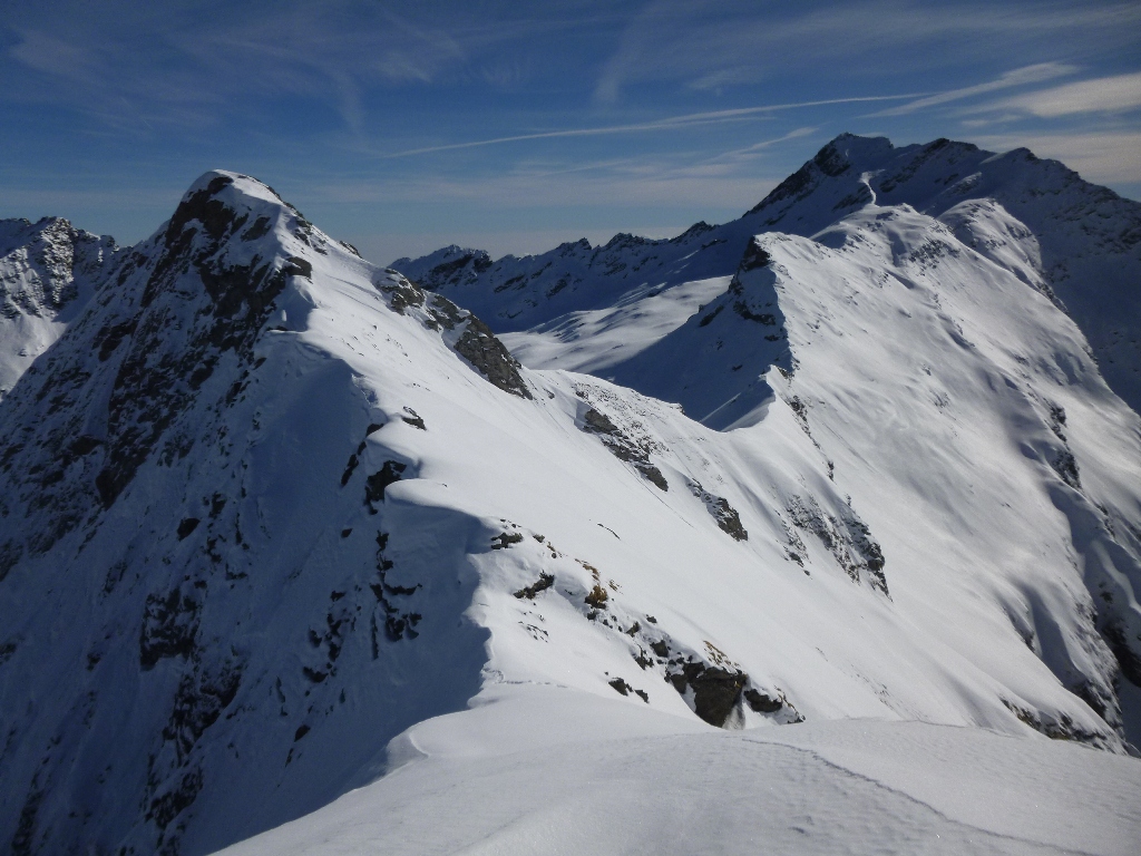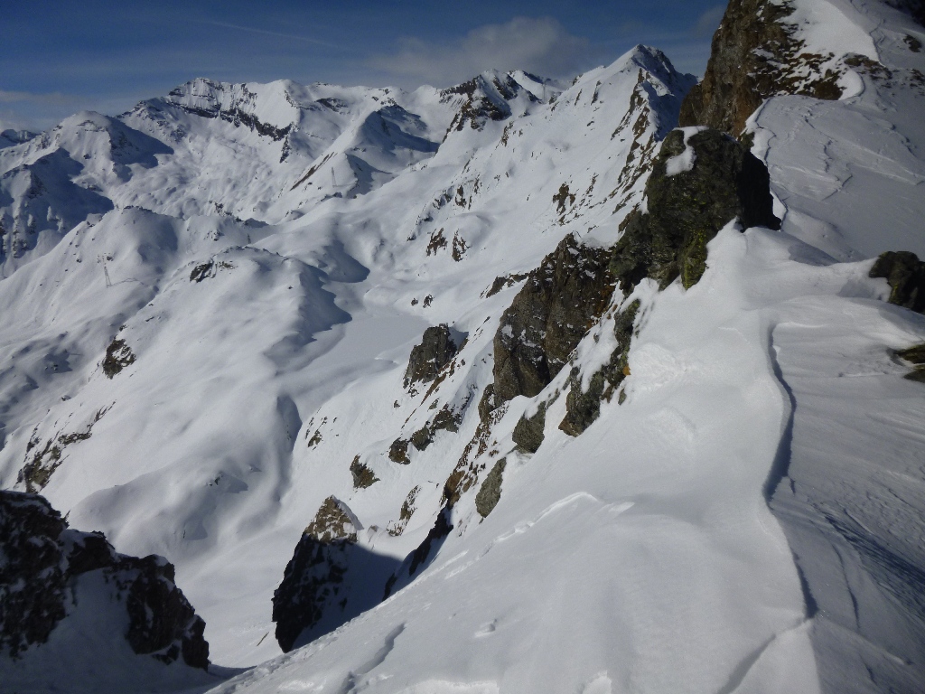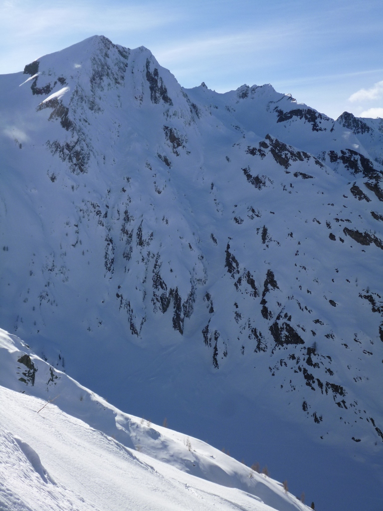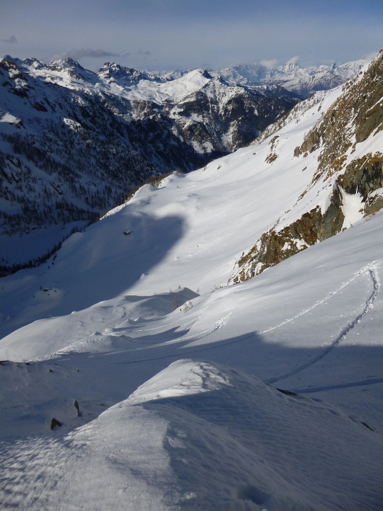 Deux beaux itinéraires que j'avais remarqués lors d'un repérage estival. Le couloir NE de la Facciabella fait 500m de haut et présente deux sections à 45° (sur 100m en tout). La NO de la Fricolla est moins raide mais très agréable et esthétique à skier.