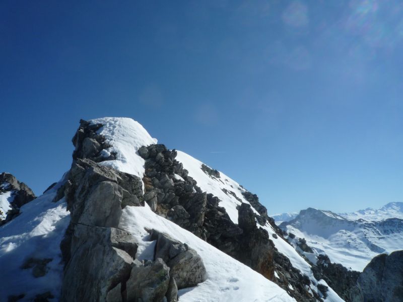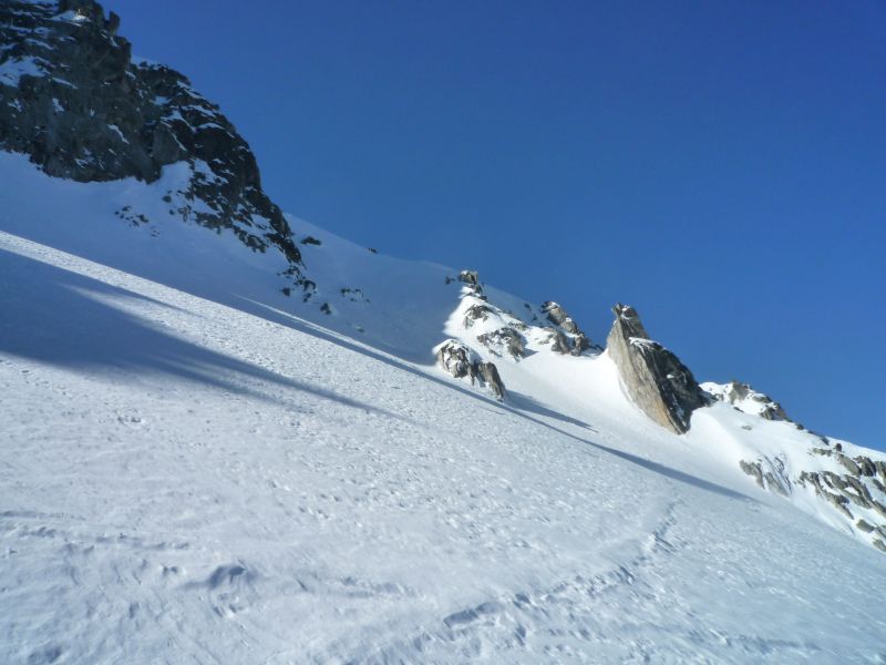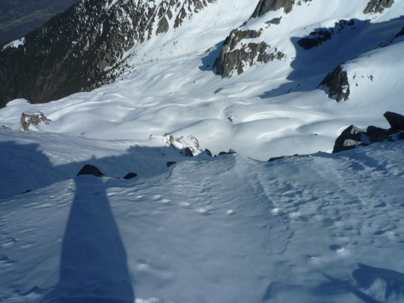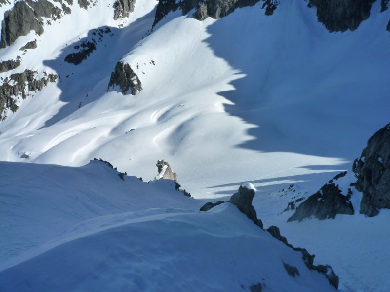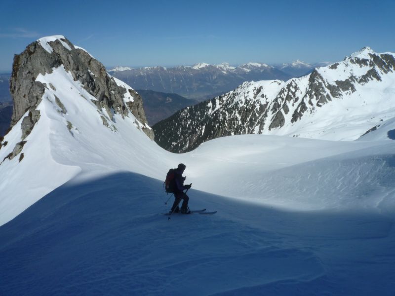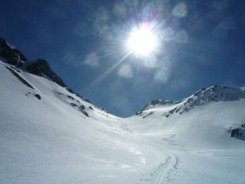 Isolement total derrière le Col de Sarvattan avec encore des conditions de neige froide.Le contraste est étonnant entre les 2 versants du Col(pas loin de 15° d'écart).La couenne finale est un peu plus raide que je ne pensais.