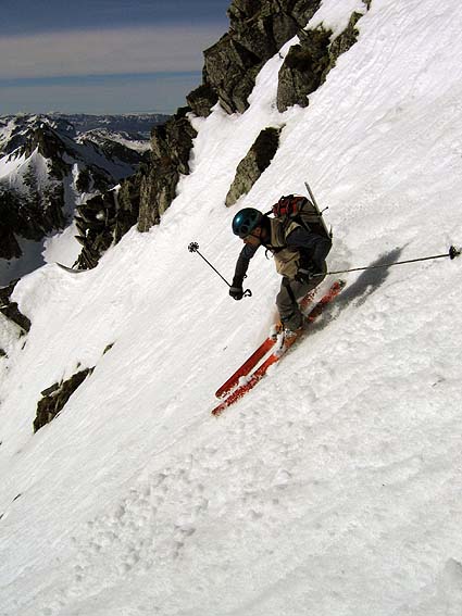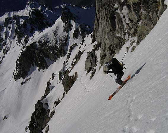 Des Perelles, montée au pied du FGV. Empilement du couloir de gauche (dit sud) et du couloir de droite (dit sud-ouest). Plusieurs variantes de descente. Cotation ski : 4.3/E3 pour le gauche, 4.3/E4 pour celui de droite (selon notre itinéraire, sinon E2)