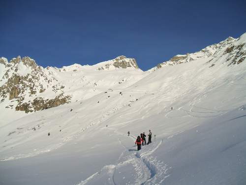 Montée au col de Sarvatant, puis Rocher de Sarvatan. De là, on skie en versant nord jusqu'à 2200m, puis on remonte vers le Faux gros Villan par le couloir, sortie à 2600. Au retour, descente jusqu'à 2200m pour profiter de la poudre. En gros un petit 1500 de D+.