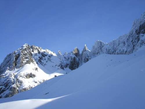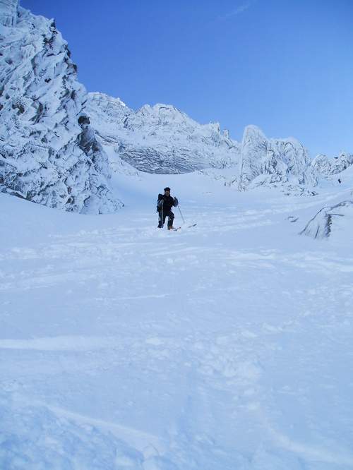 Bonne neige dans l'ensemble, de la poudre froide dès que l'on bascule au nord, en bonne quantité mais la sous-couche reste très faible. le couloir était très rempli, et malgré la croute de quelques cm, il fut très agréable à skier.