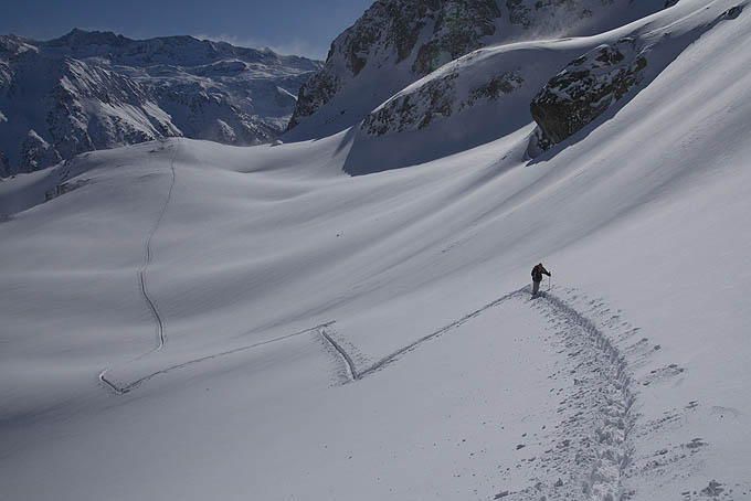 C'est hyper chargé de partout. Aucune trace de plaque observée mais à chaque conversion, la neige en cours de densification par le vent se décroche en plaquettes. On n'a pas tutoyé de pentes >30° et encore, dans le 30° ce n'est que pour des ressauts <100m de déniv. La sécurité m'a paru être à ce prix aujourd'hui.