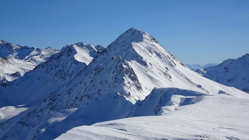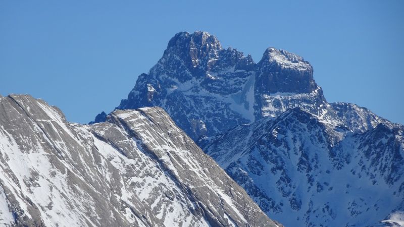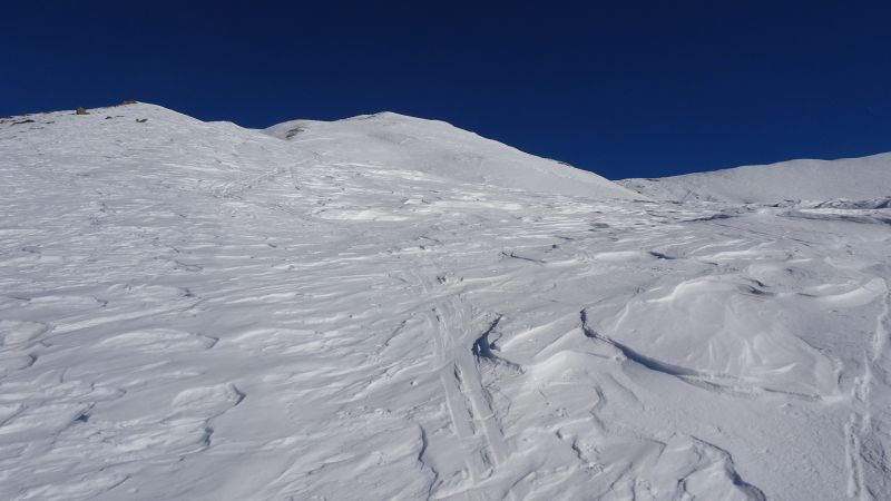 Tout le versant est en neige durcie couverte plus ou moins régulièrement de moins de 10cm de neige froide à grains fins distribuée un peu plus généreusement dans les combes. Ski agréable, seul le bas qui chauffe un peu voit la croûte fragilisée en milieu d’après midi.