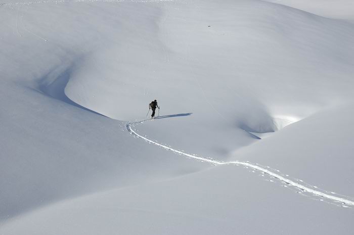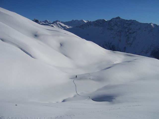 Dès notre arrivée, les locaux nous ont alertés sur la dangerosité des pentes Queyrassines. RAS sur ces pentes douces, mais en sondant, on trouve le mélange suivant : poudre froide sur qq cms de croûte pas toujours dure, elle même recouvrant les gobelets sur une épaisseur parfois impressionnante